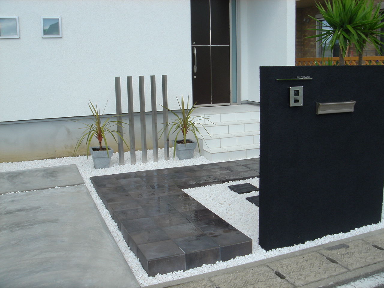 廻りに敷き詰められた白い砂利も手伝って、アプローチが浮かびかがります。