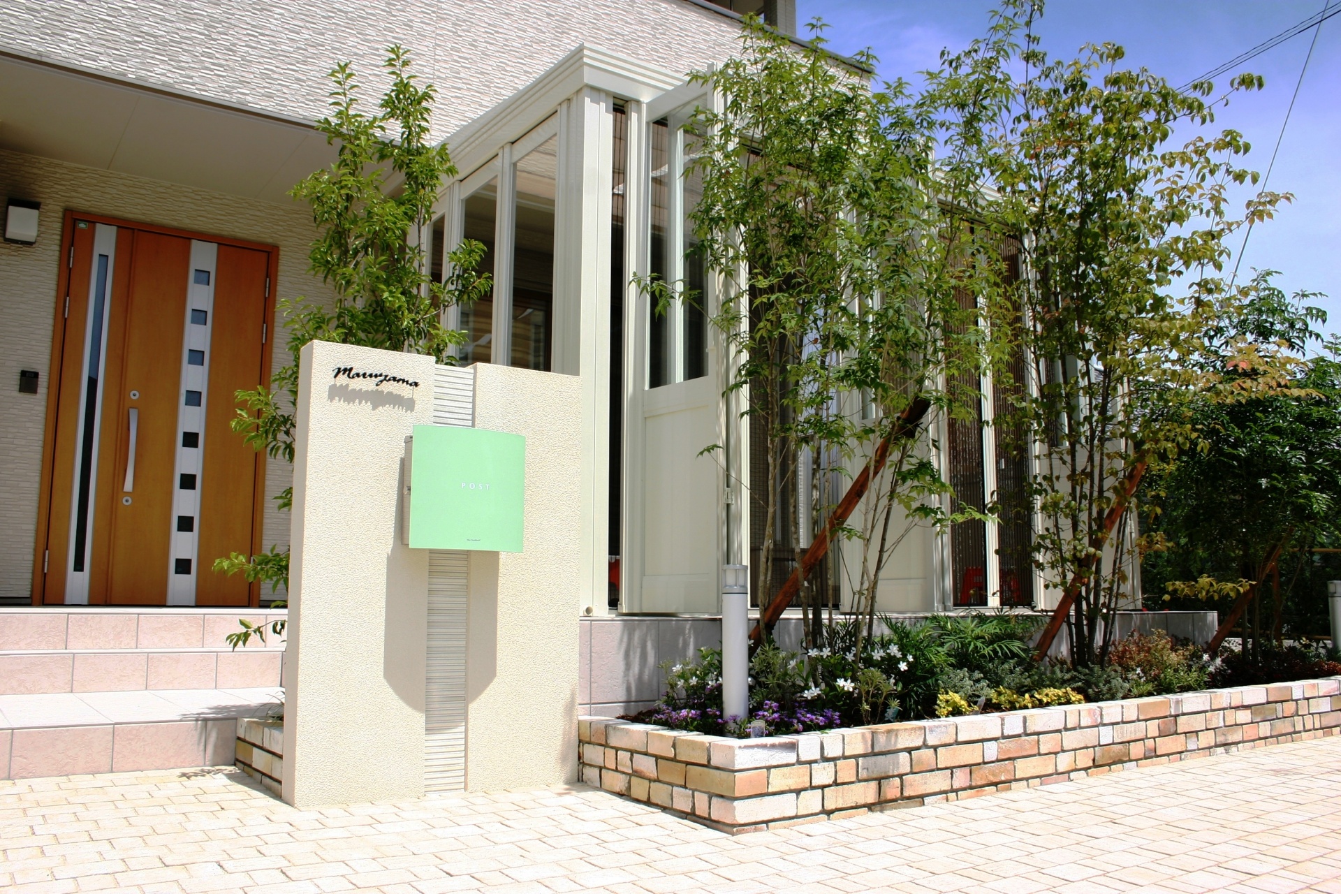 白を基調とした中に爽やかなアイスグリーン色のポスト、植栽の緑が建物と調和されています。
