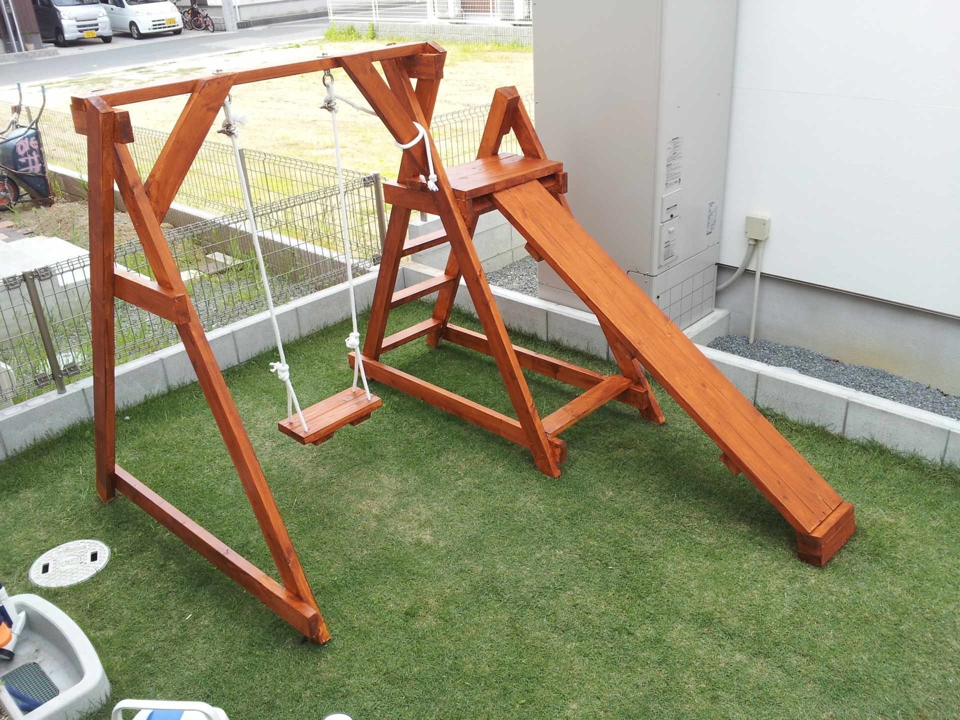 楽しそうに遊ぶお子さんの笑顔☆ 2012年6月6日(WED) 写真を下さったのは昨年工事をお任せ頂きました姫路市U様です。 どこかの公園で木製の滑り台やブランコなどの遊具を見られ、 「これなら自分でも作れるのでは!」 と思われ、材料を買いご自分で作られたそうです。 あまりの完成度の高さにビックリしました。 ↓ ↓ ↓ 芝生もきれいにお手入れされており、お庭を作らせていただいた私達としては 本当に嬉しい限りです。 Kajiwara