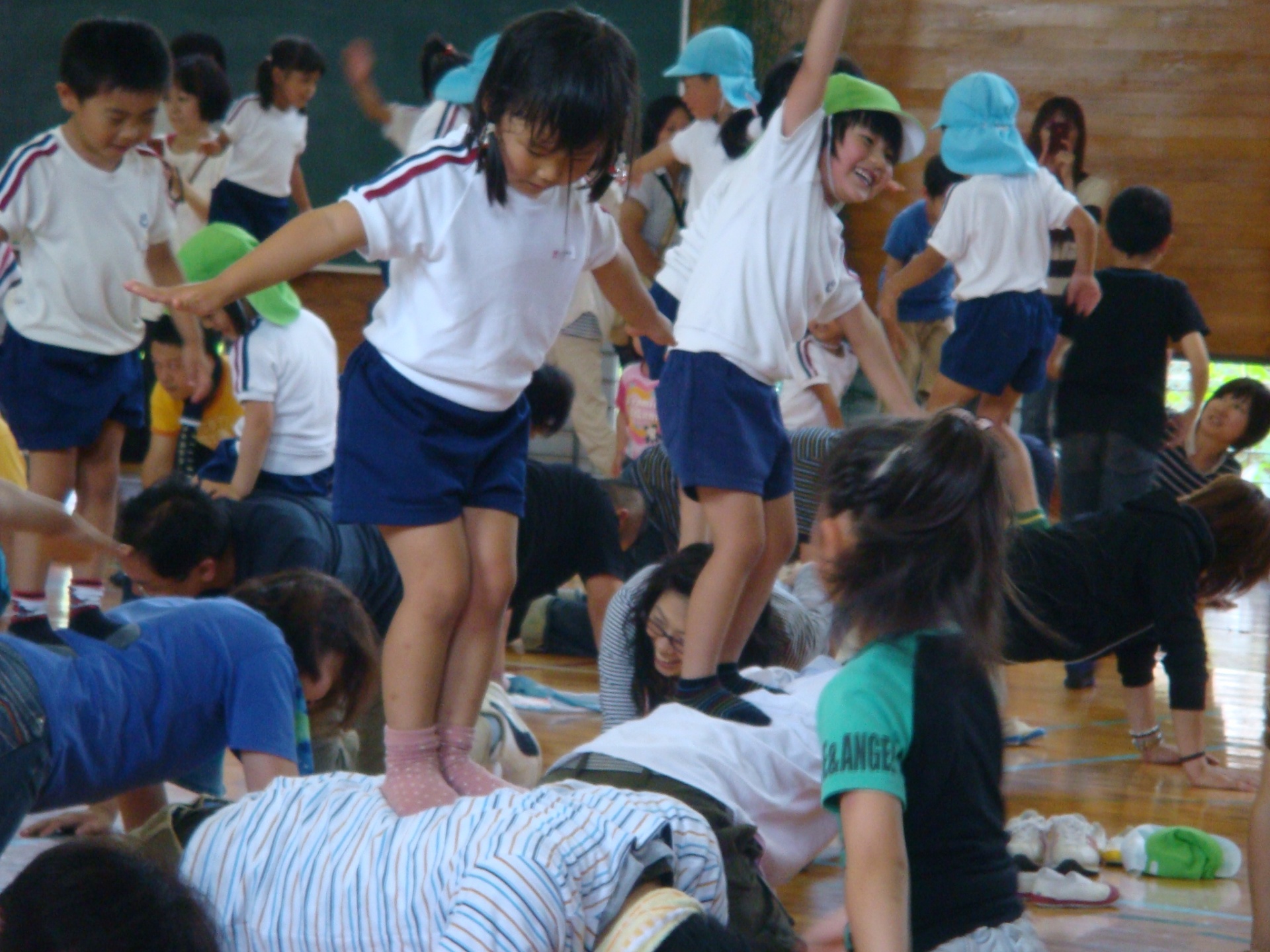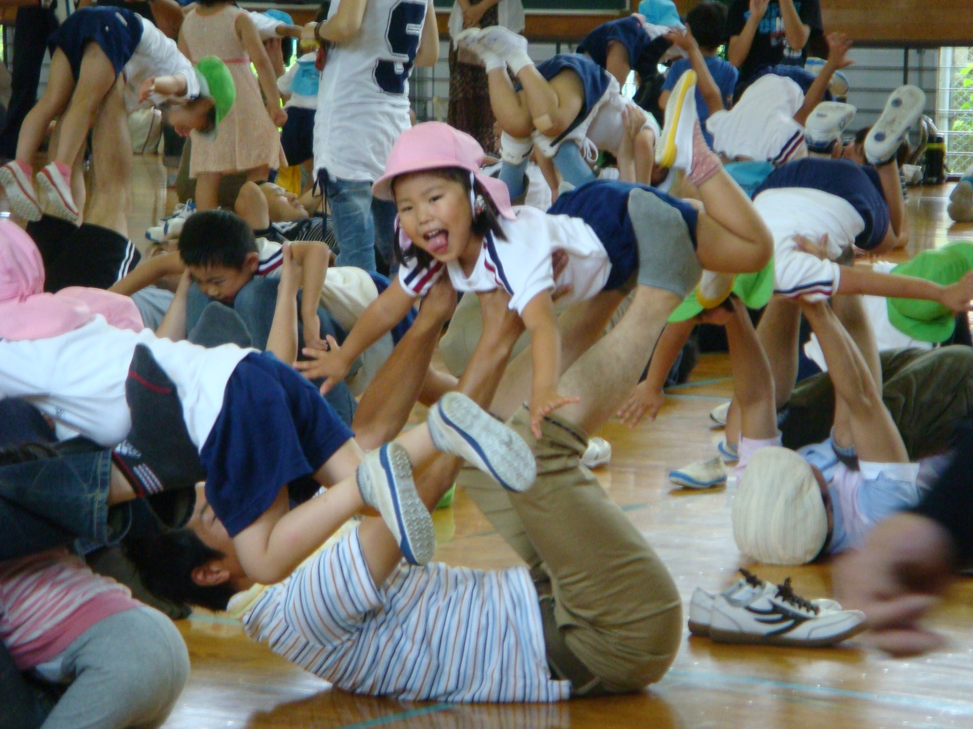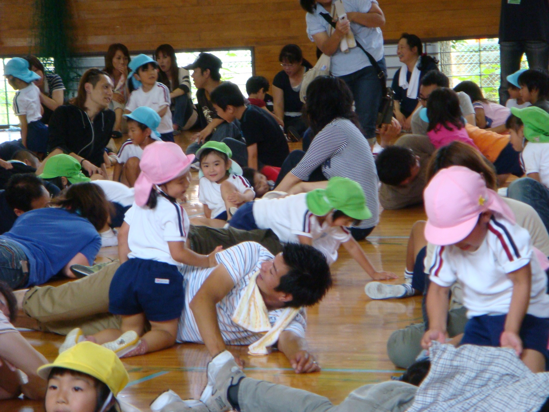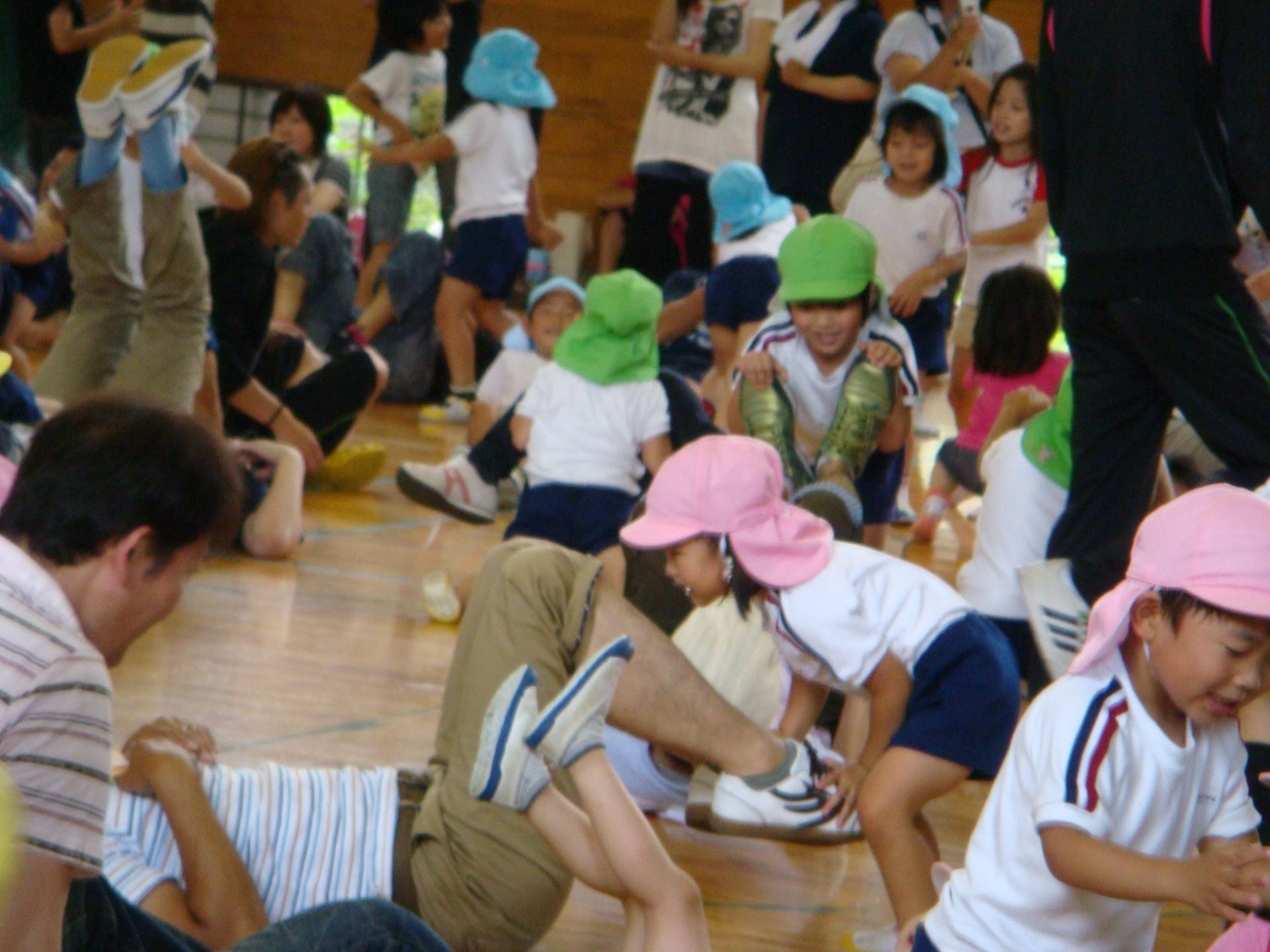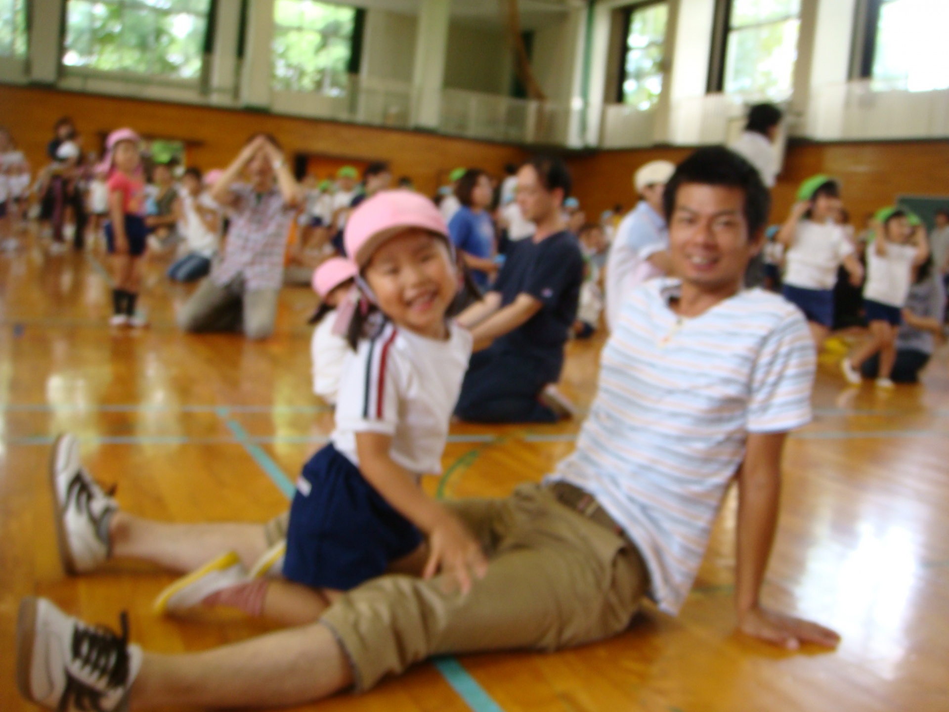 ファミリー参観(親子体操) 2012年6月18日(MON) 先日、娘が通う幼稚園でファミリー参観(親子体操)がありました。 普段、子供と触れ合うことが少ないお父さん達の為に体を使って スキンシップを取るという内容です。 家でやったことある?orない? 色々な遊びがあり梅雨時期の蒸し暑い体育館で爽やかな汗をかく事が出来ました。 明日、明後日には筋肉痛になっているかな? 子供の体力にびっくりしました。「結構、力あるんやな」と Kajiwara