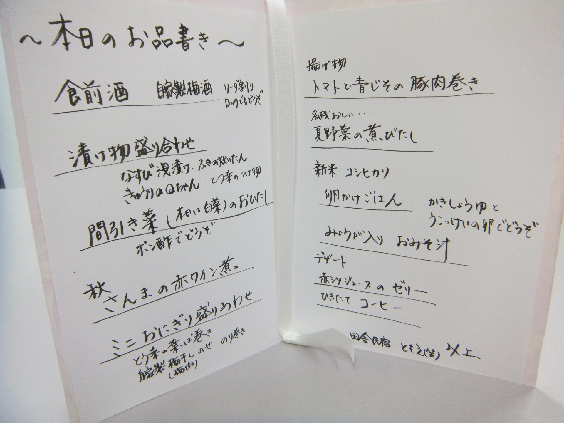 女将に転職?? 先日のお休みに、お庭に関する仕事をしているお友達を我が家にお招きして、「新米を食す会」を開催しました。 「我が家で採れた」新米とお野菜に出来るだけこだわってメニューを作り、おもてなし。 当日は、田舎民宿ともえの女将として、お料理を作ったり、近所をご案内したり、稲わらリースベースのワークショップをしたり・・・ 大忙しの1日でした。 女将としてバタバタしていたので、写真を撮るのを忘れてしまい、結局お品書きの写真のみになってしまいましたが(^_^;) 時々、こんなことをして遊んでいます。