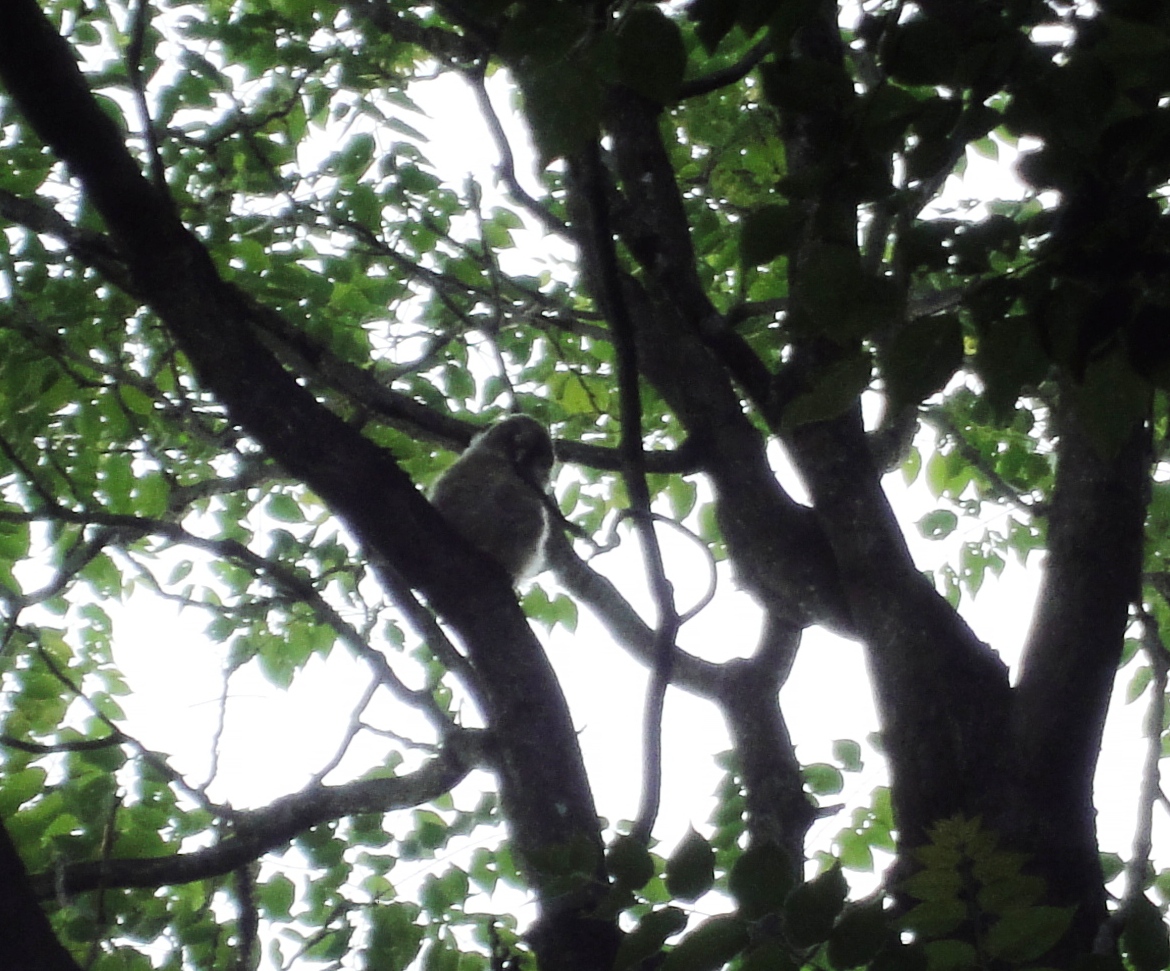 親フクロウを探していたら、10mくらい後方の低い枝に止まって居るのを