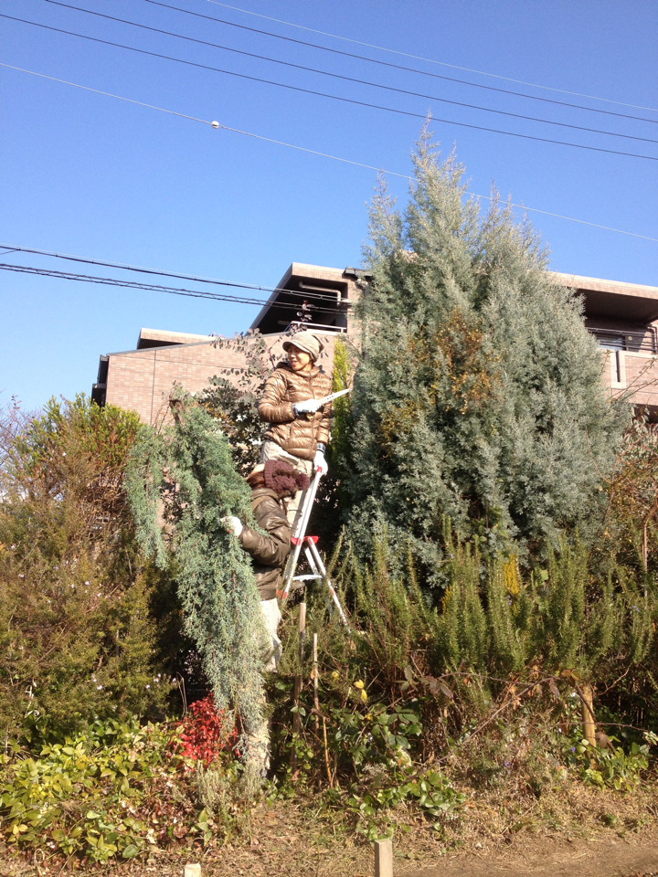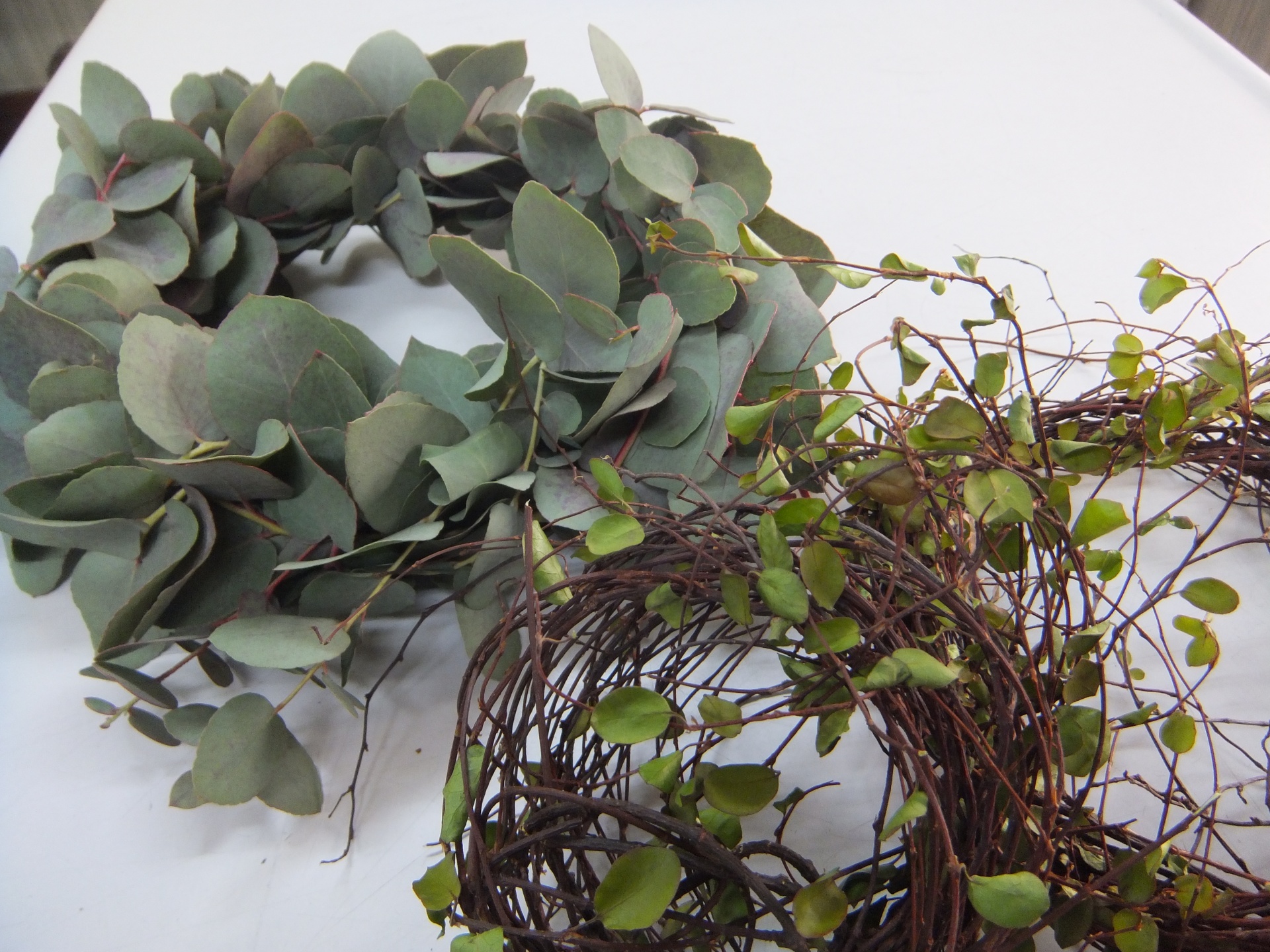 真冬の剪定 水曜日のお休みに、私の尊敬するKさんの畑にお邪魔してきました。 豊中の住宅街の一角にある貸農園。 こんな都会に畑があるなんて(^O^)今回のミッションは、「畑で大きくなったユーカリの木とブルーアイス(コニファー)を剪定して、リースを作る」です。 もう一人のお友達と一緒に脚立に上り、のこぎりを持って剪定すること約3時間。畑でそのまま整枝した枝をクルクル・クルクル・・・巻いてまいて出来たのがこちら ↓↓↓ 左が丸葉のユーカリ、左がワイヤープランツ(^O^)結構可愛くできました。いかがでしょう??