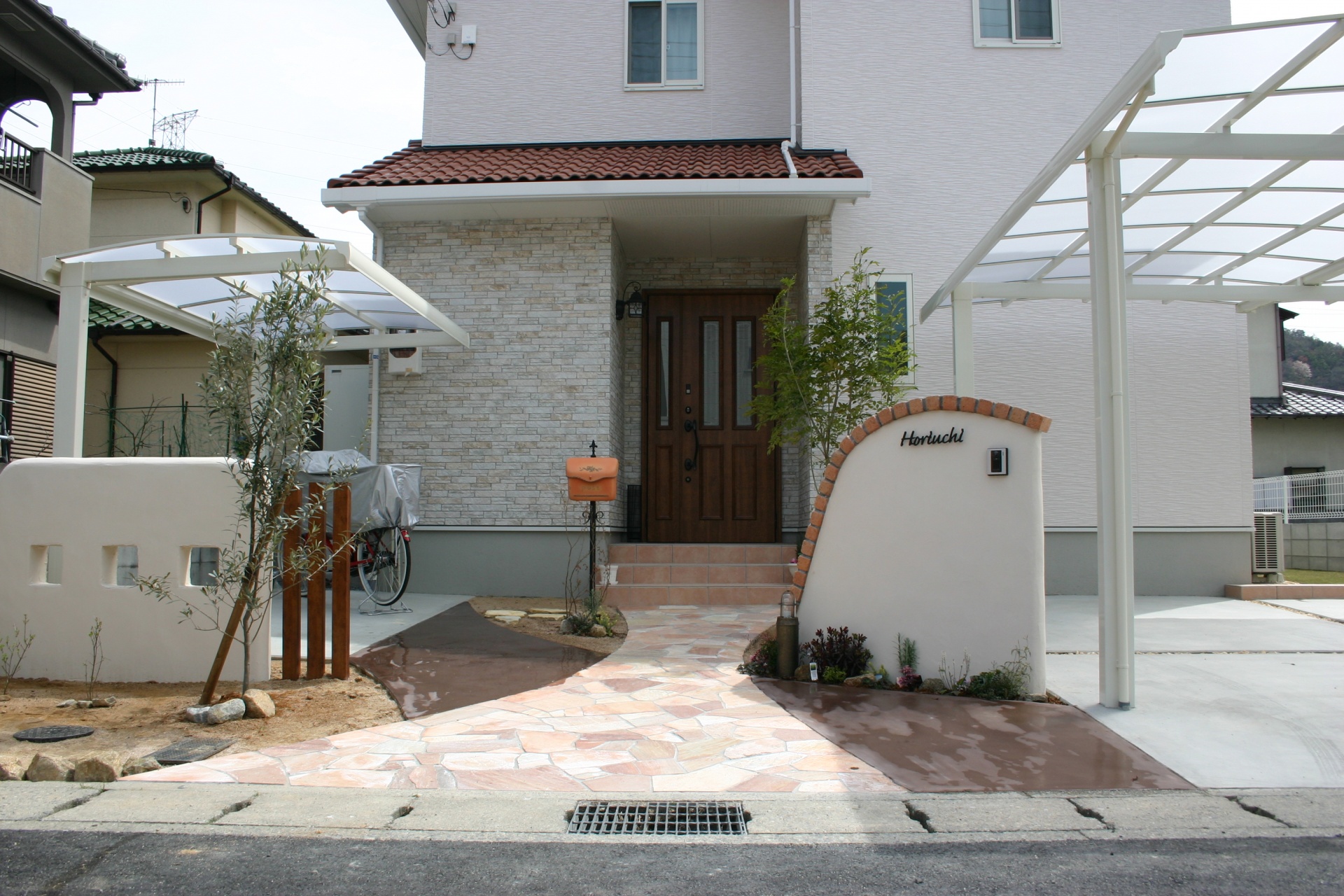 1段追加したオレンジ/ピンク系の玄関ポーチに自然石のアプローチが続いていきます
