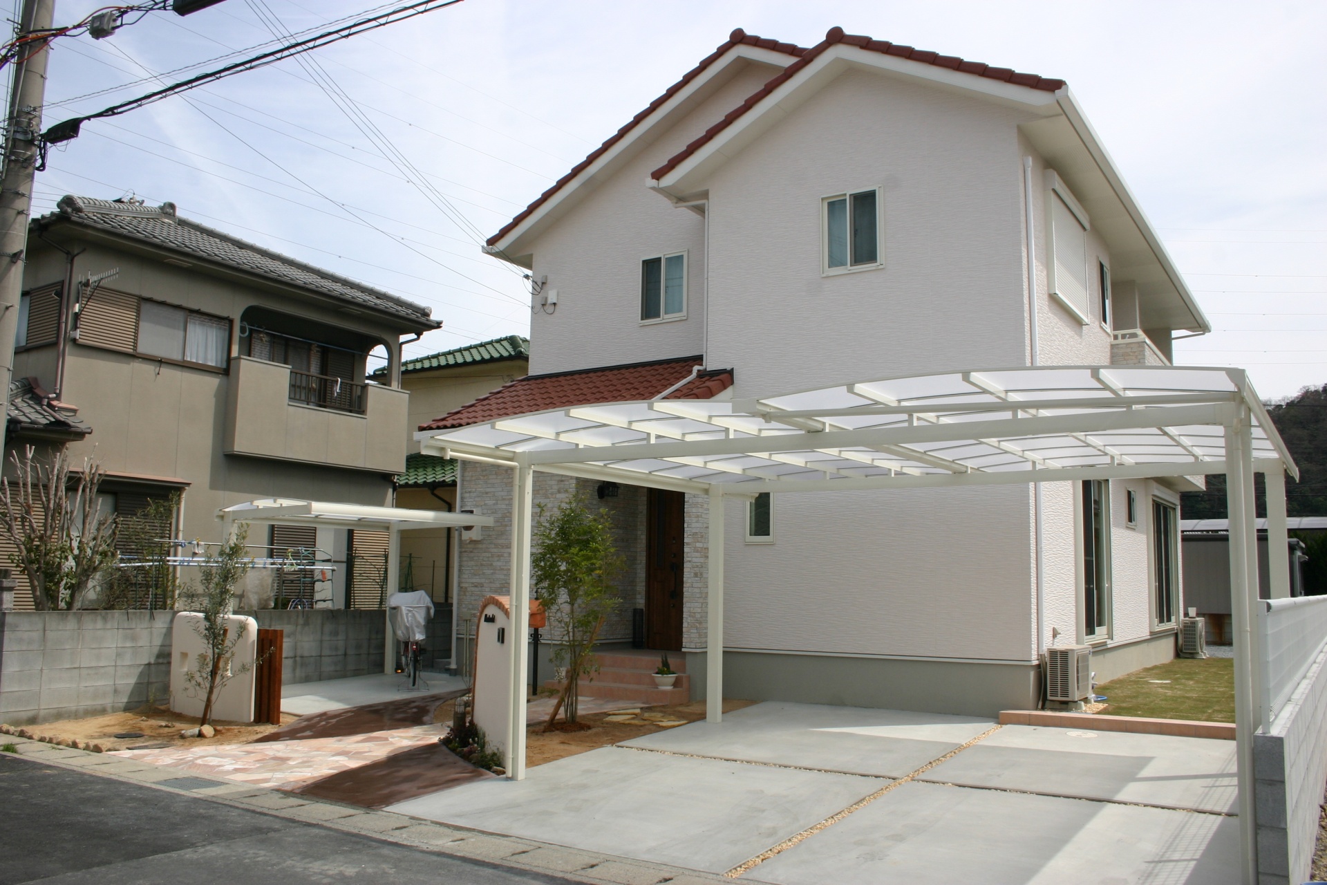 2台分のカーポートの後ろにはタイルステップ~緑の芝生へと繋がっていきます
