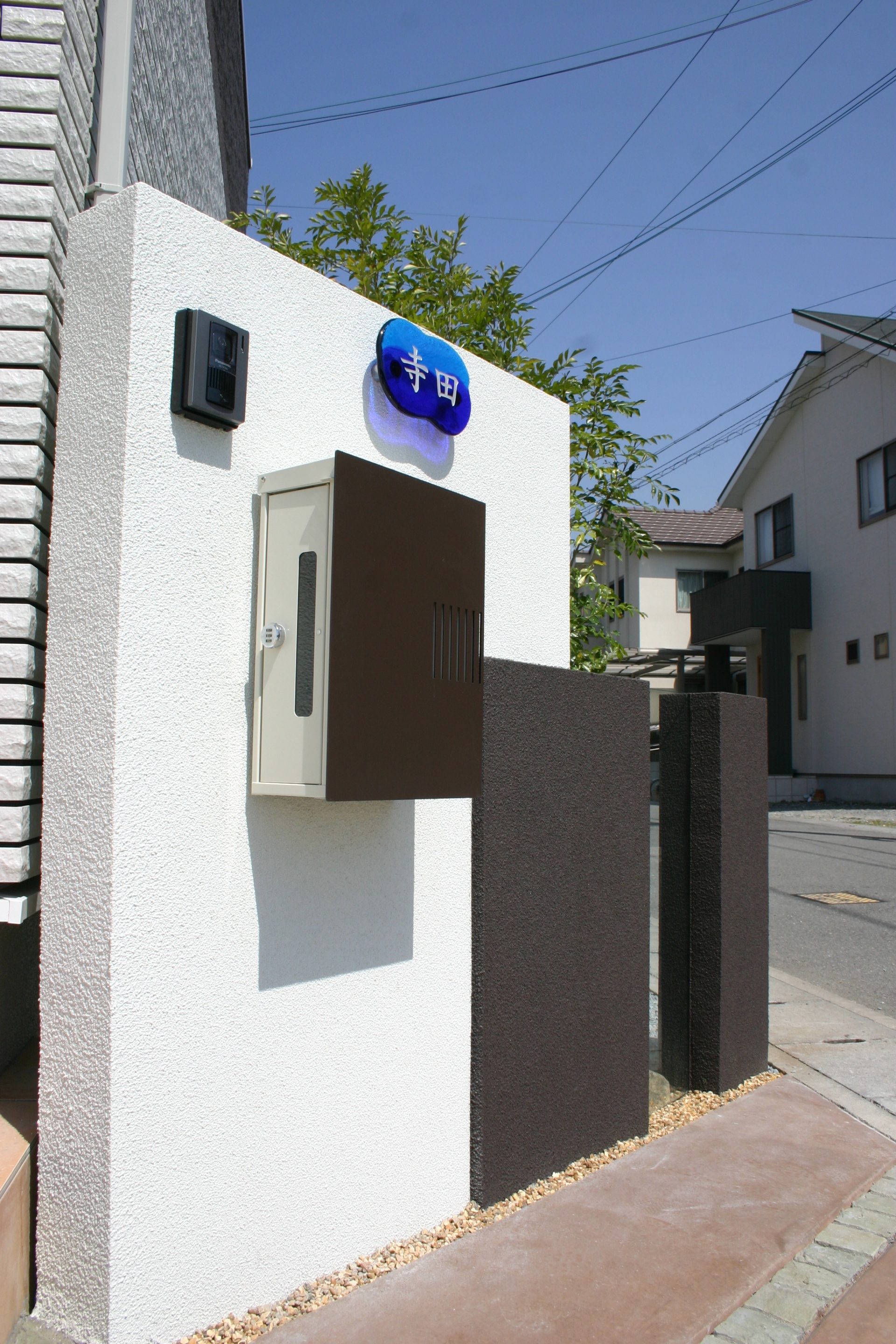 建物を意識した白とこげ茶の門周り+モダンなガラスと植栽