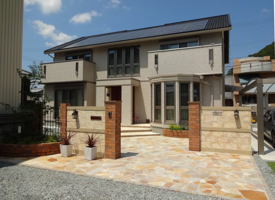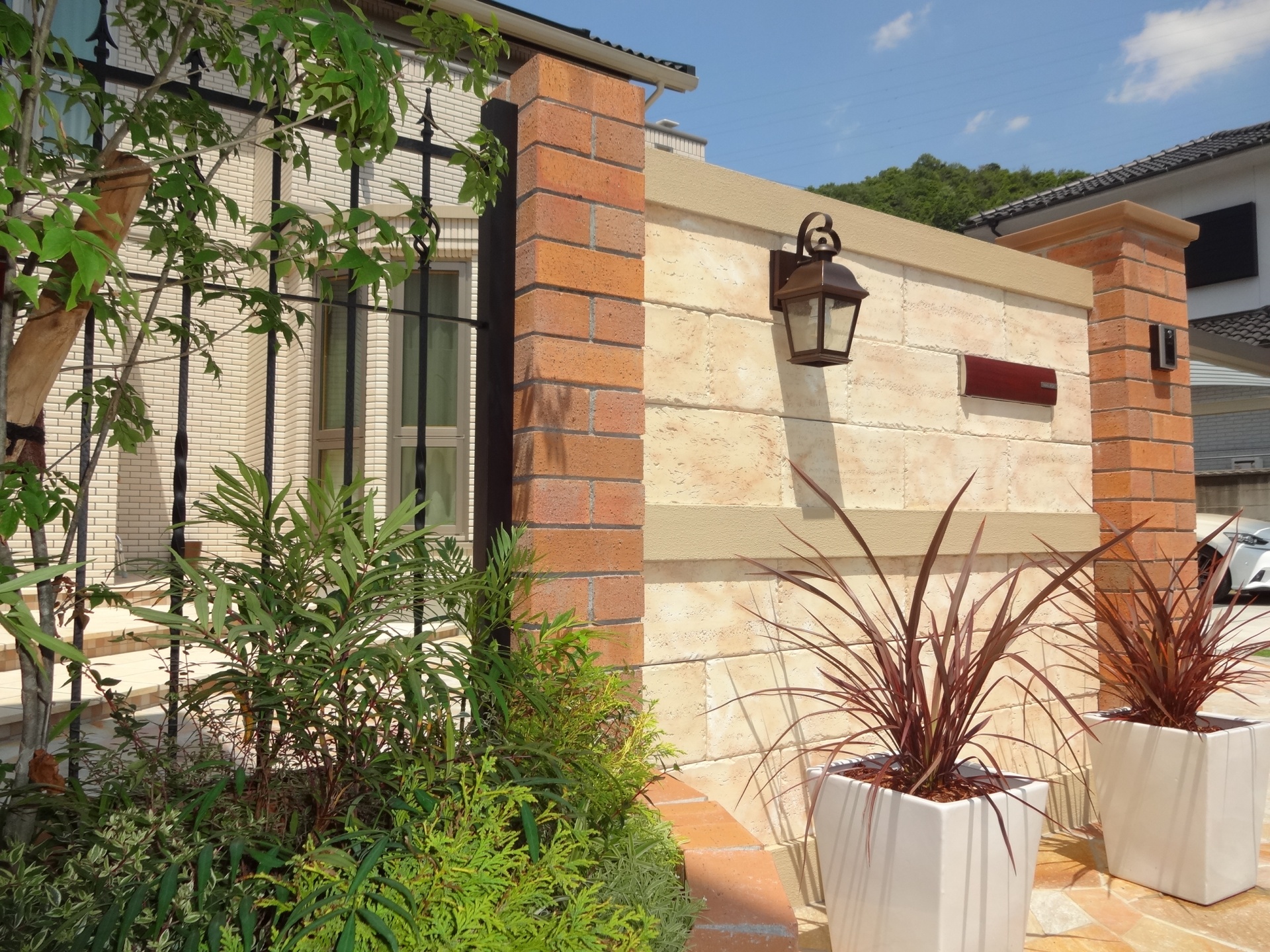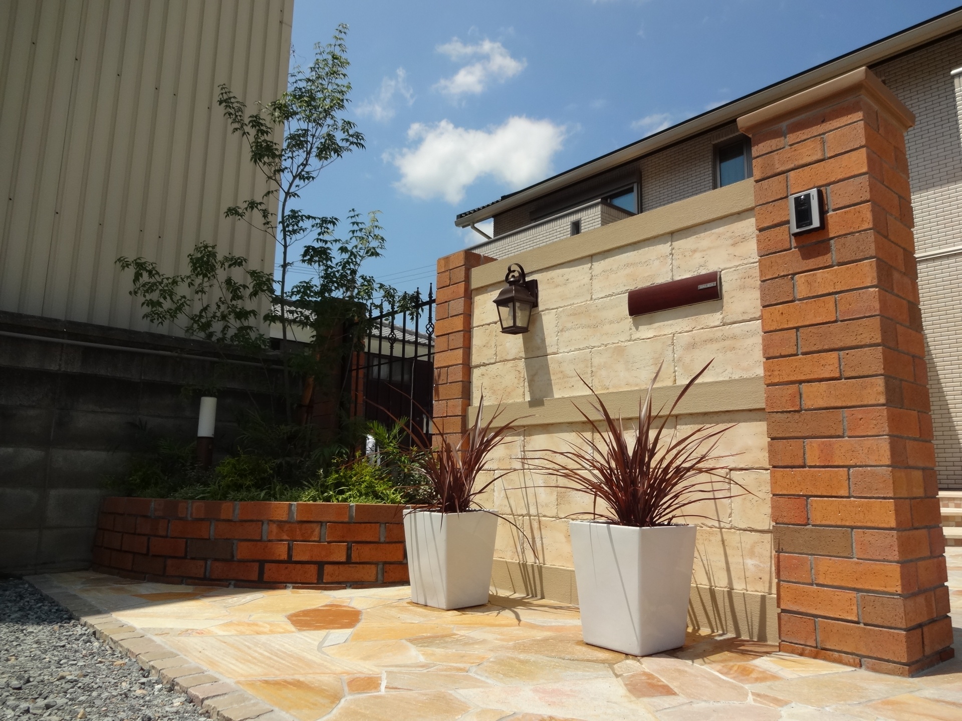エレガントなエントランスデザイン 姫路市A様邸 2016年6月27日(MON)石張りに時間がかかりましたが、植栽も入り完成しました「エレガントなエントランスデザイン 姫路市A様邸」建物の迫力に負けないように門回りもゆったりと豪華にをテーマにデザインしましたレンガ門柱やタイル張りなど様々な素材を使用していますが 全体の色目を統一することで建物とも調和してくれます 植栽スペースの背面にはアルミ鋳物製のフェンスがエレガントさを強調しています 赤葉のニューサイランンは鉢植えで門袖壁の前に配置することで来客の目を楽しませるエントランスとなっています
