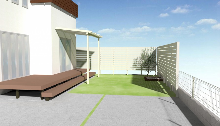 ウッドデッキがあるお庭周りは目隠しの樹脂フェンスを予定しています