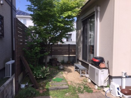 太子町T様邸ウッドデッキお庭リフォーム工事 2017年4月24日(MON)太子町T様よりお庭のリフォーム工事のご依頼をいただきました 足元の雑草対策も兼ねて床面にローデッキを敷きます1.0m位で購入されたイロハモミジが立派になりその思い入れのあるモミジをお家やお庭に出て眺めることが出来る仕様にリフォームさせていただきますローデッキをモミジの足元だけくりぬき夜には足元からのライトアップがお昼間と違った表情を見せてくれると思います お家の方にウッドデッキの解体・処分はお願いしましたGW以降に土を漉き取りデッキ下部分はコンクリートを打設します雑草対策にもなりますデッキ以外は既存のレンガや枕木を再利用して敷きます
