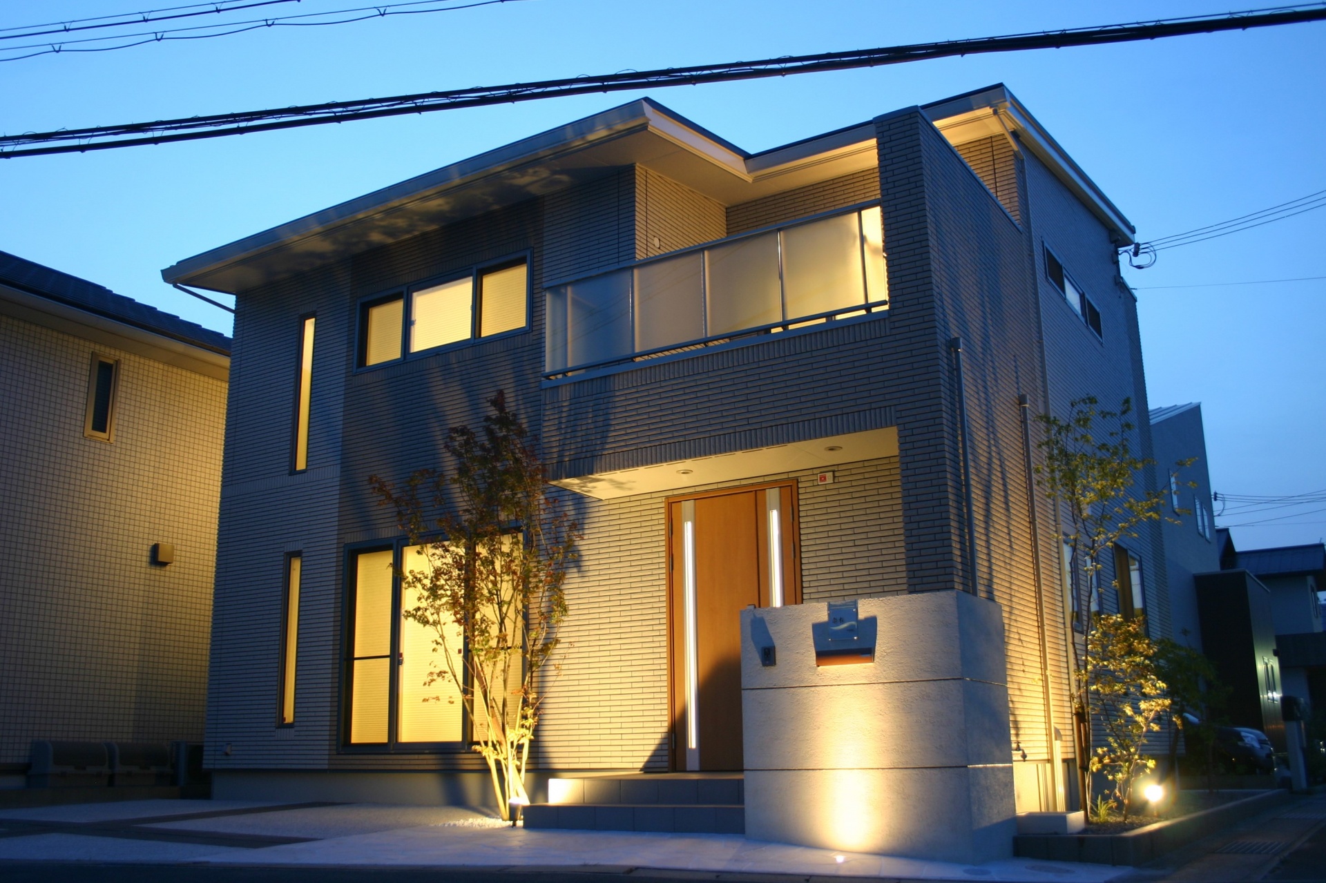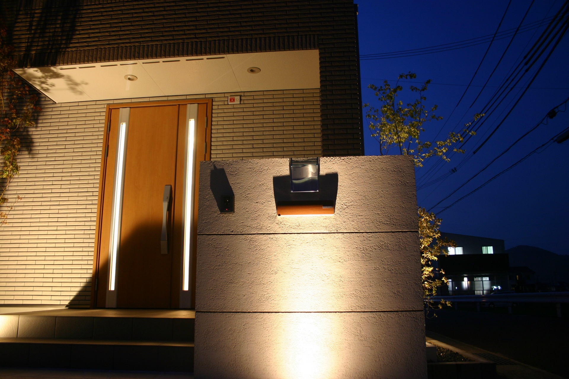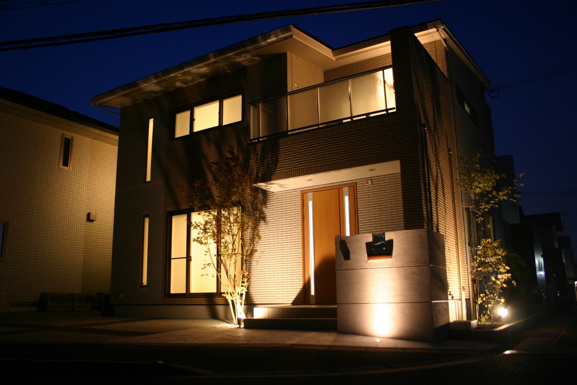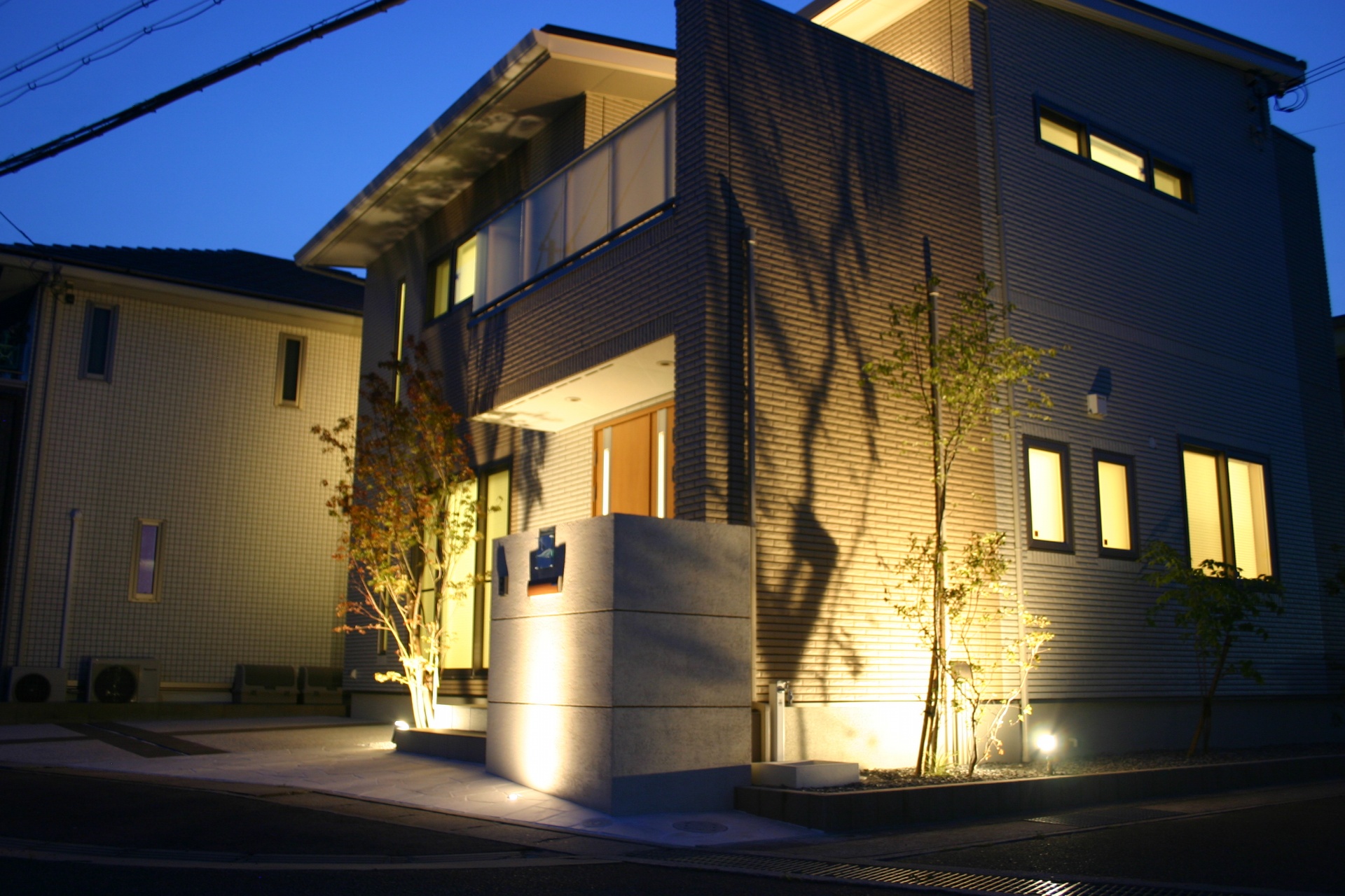 姫路市A様邸外構完成写真ライトアップ 2017年7月31日(MON)先日、外構工事が完成しました姫路市A様邸へ夜のライトアップ写真を撮りに伺いました昼間は現場管理などで何度も見ていましたが夜の完成ライトアップの表情は始めてなので徐々に日が沈むにつれて照明の存在感が出てきました 電球色で統一されていますので建物と一体感があり綺麗です 門柱の足元に埋込みタイプのLEDがあり夜になると壁を上がっていく光源が綺麗に映ります 建物外壁に陰影を作るようにアズキナシの足元にスポットライトを配置しています