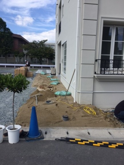 芝生の下地は砂で地を整えて肥料を混ぜて