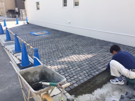 土間部分は90□のピンコロ石をウマ目地で敷き詰めていきます