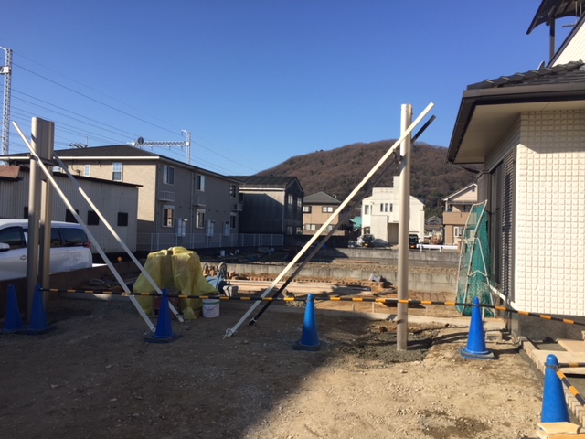太子町U様邸三協アルミ:フォーグワイド工事 2018年2月19日(MON)幅が2台分のカーポートで2本足タイプは柱部分は重機で掘削し生コンクリートの打設を行い柱を据え付けます通常の4本足2台分駐車のカーポートと比べると作業や費用も掛かりますが エクステージではこのような基礎工事を標準仕様としてお客様に写真でご説明させていただいております見た目に少し不安を感じる方もおられますが施工現場写真を見て頂くと安心していただけます