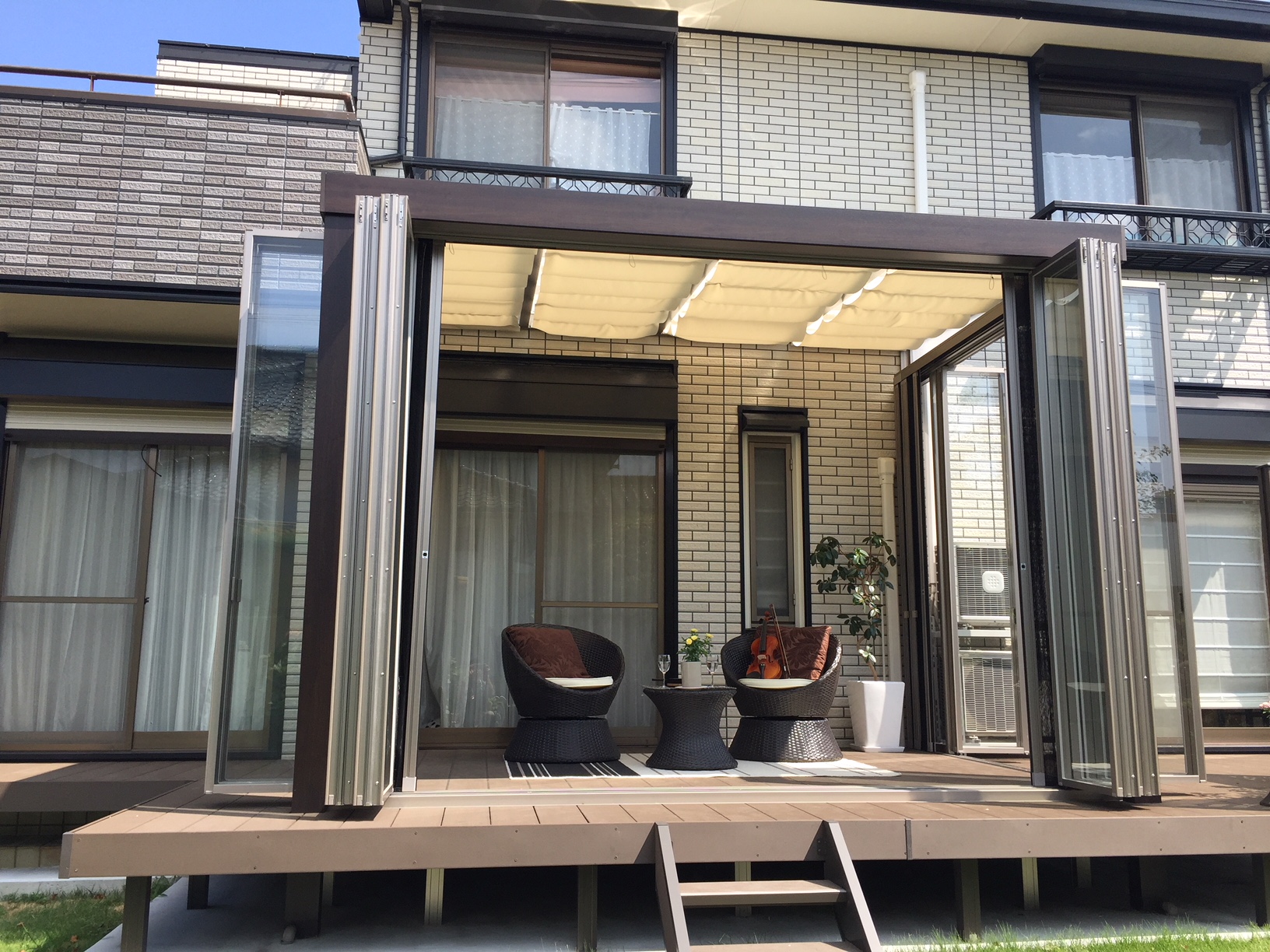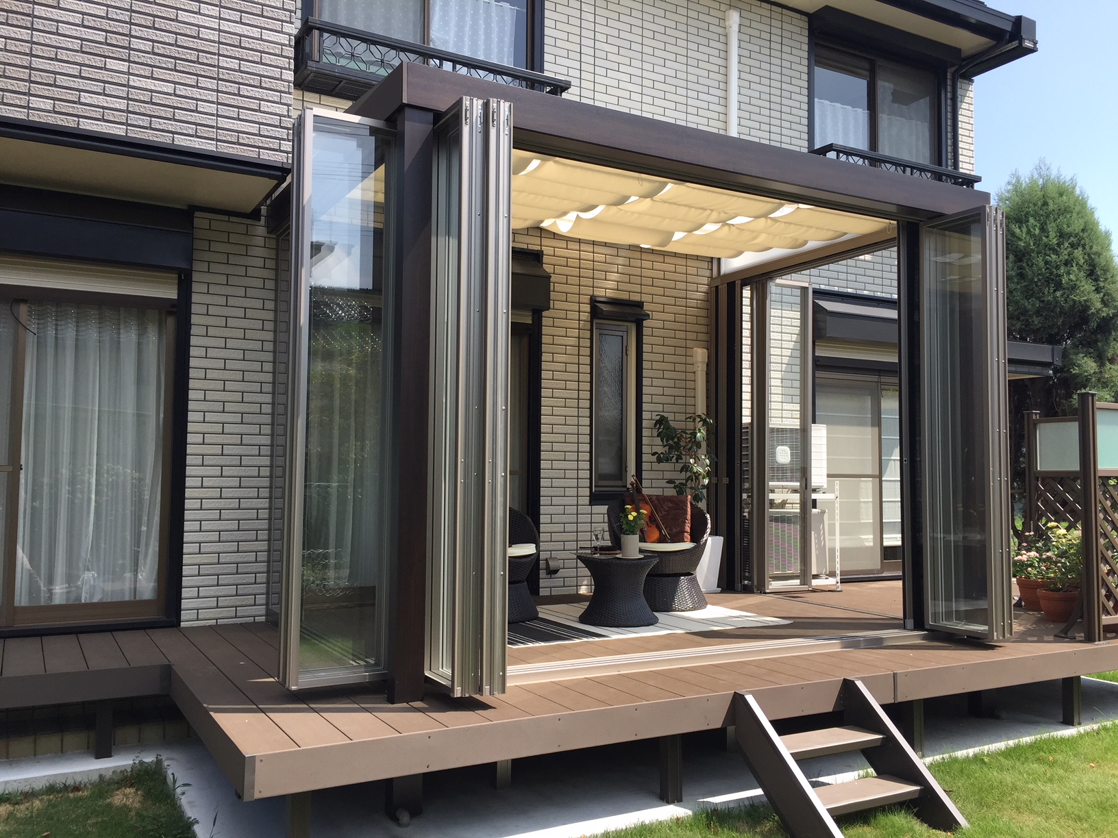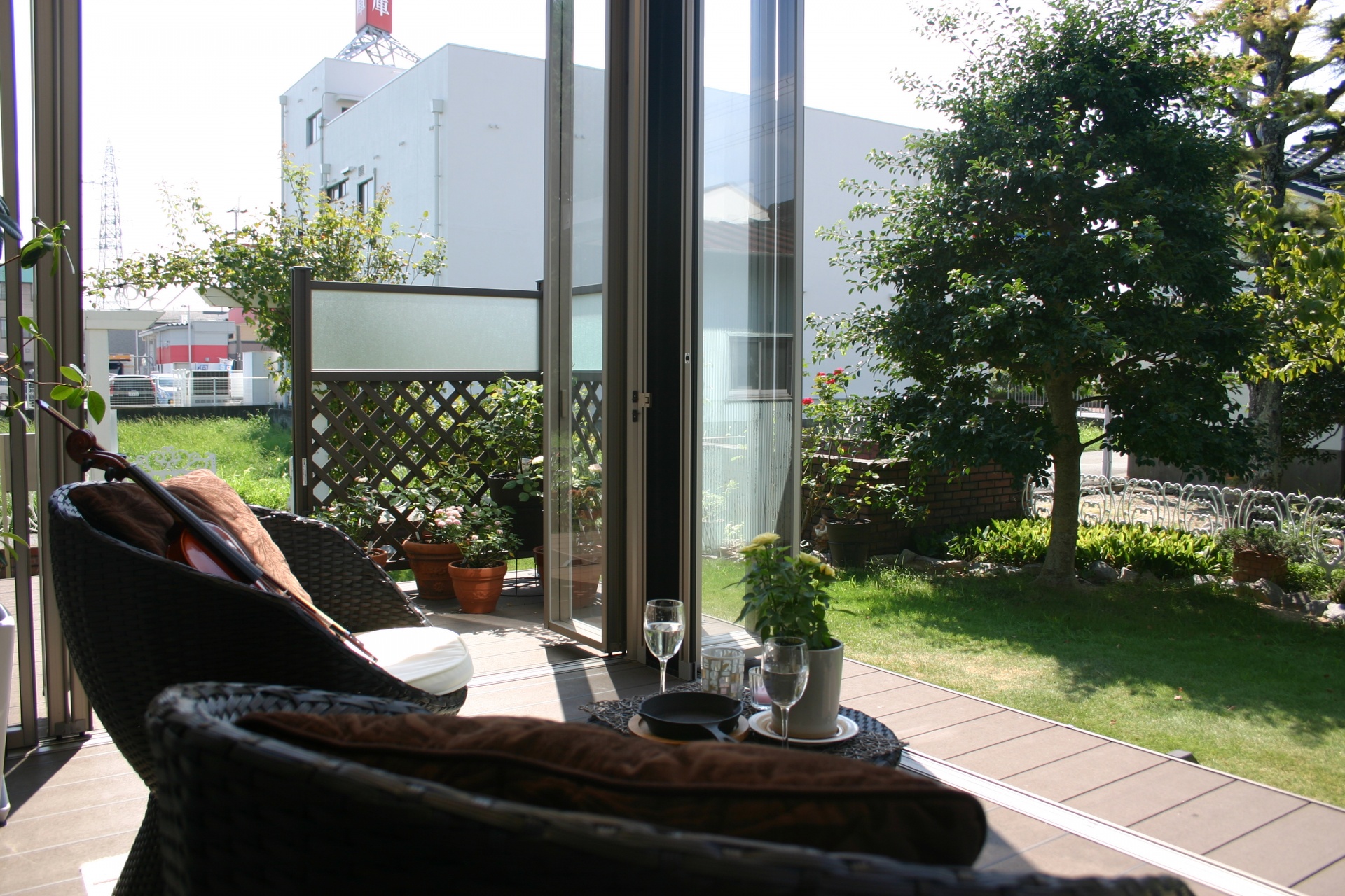 ジーマガーデンルームで朝食を 2018年8月6日(MON)朝 早い時間帯は風も心地よいとのことでジーマガーデンルームをフルオープンにしてもう一つのリビングとしてご活用されています太子町T様ウッドパーティションを設けることで程よく目隠し出来ますし上段にプライバシーパネルがあり採光も確保しています 折戸や網戸を開ければ広々とした空間になりお庭と一体感が生まれます ガーデンルーム内から見える景色もお庭で過ごすうえで重要な役目がありますガーデンルームからは芝生が広がるお庭とバラ好きなお客様のバラの鉢植えが見えます