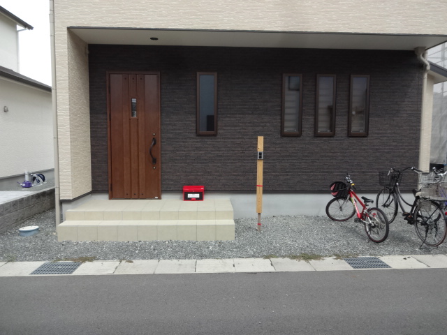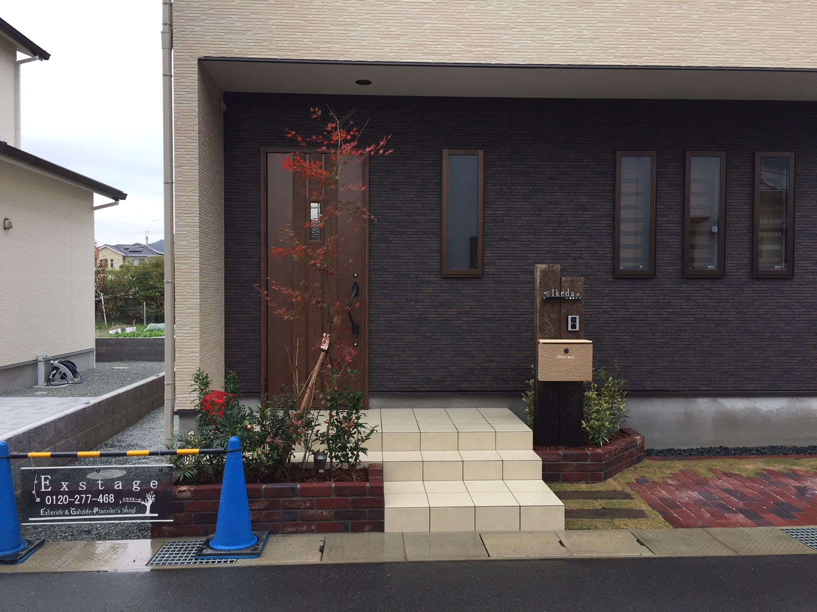 雨に濡れるとレンガの深みが増しシンボルツリーのヤマモミジとの相性もいいです