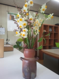 昨日の雪の重みで、当社の花壇の水仙が、倒れてしまいました。(嫌な予感はしていたのですが)