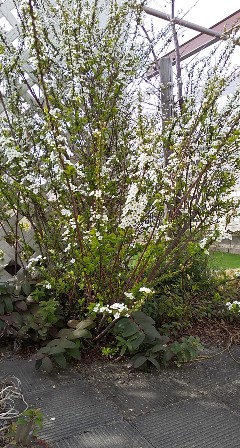 ユキヤナギが満開に当社の東側の駐車場です。