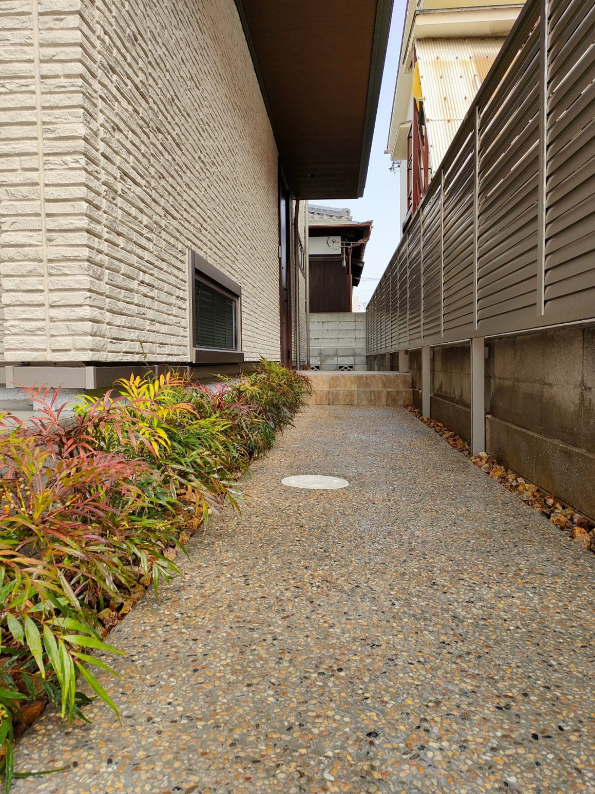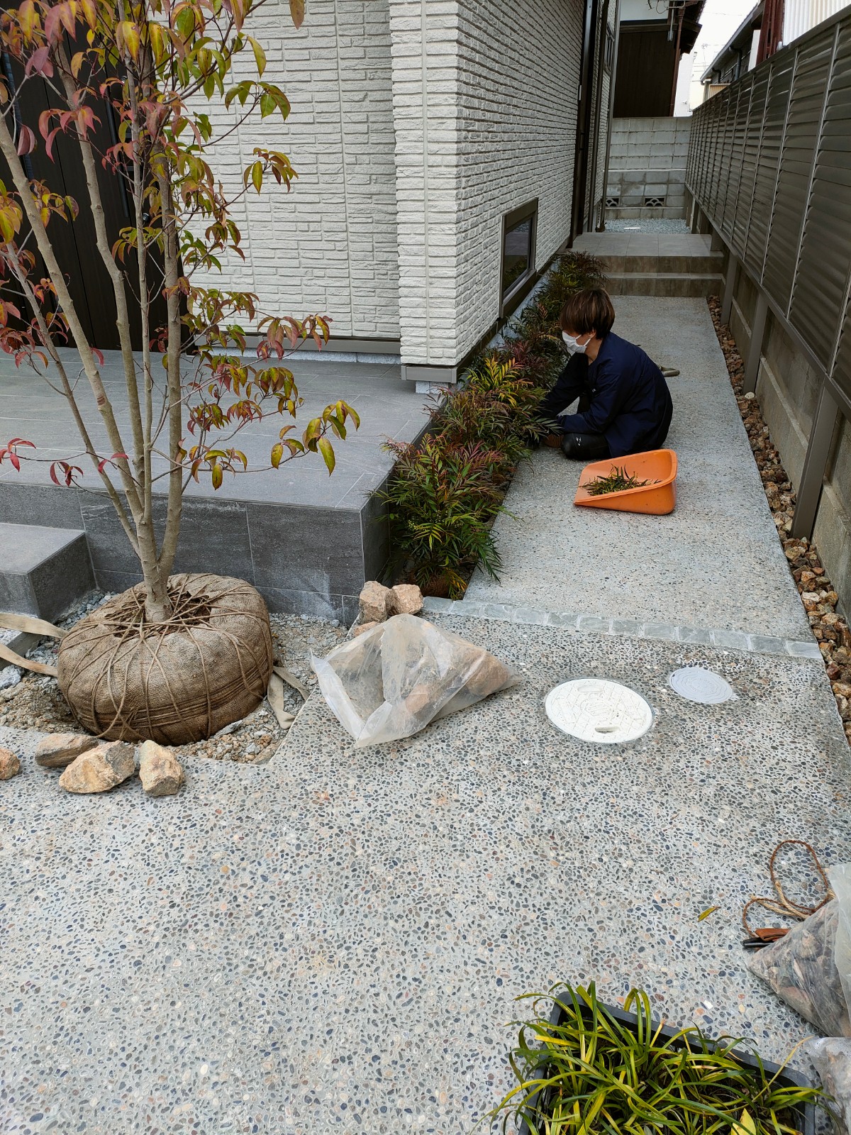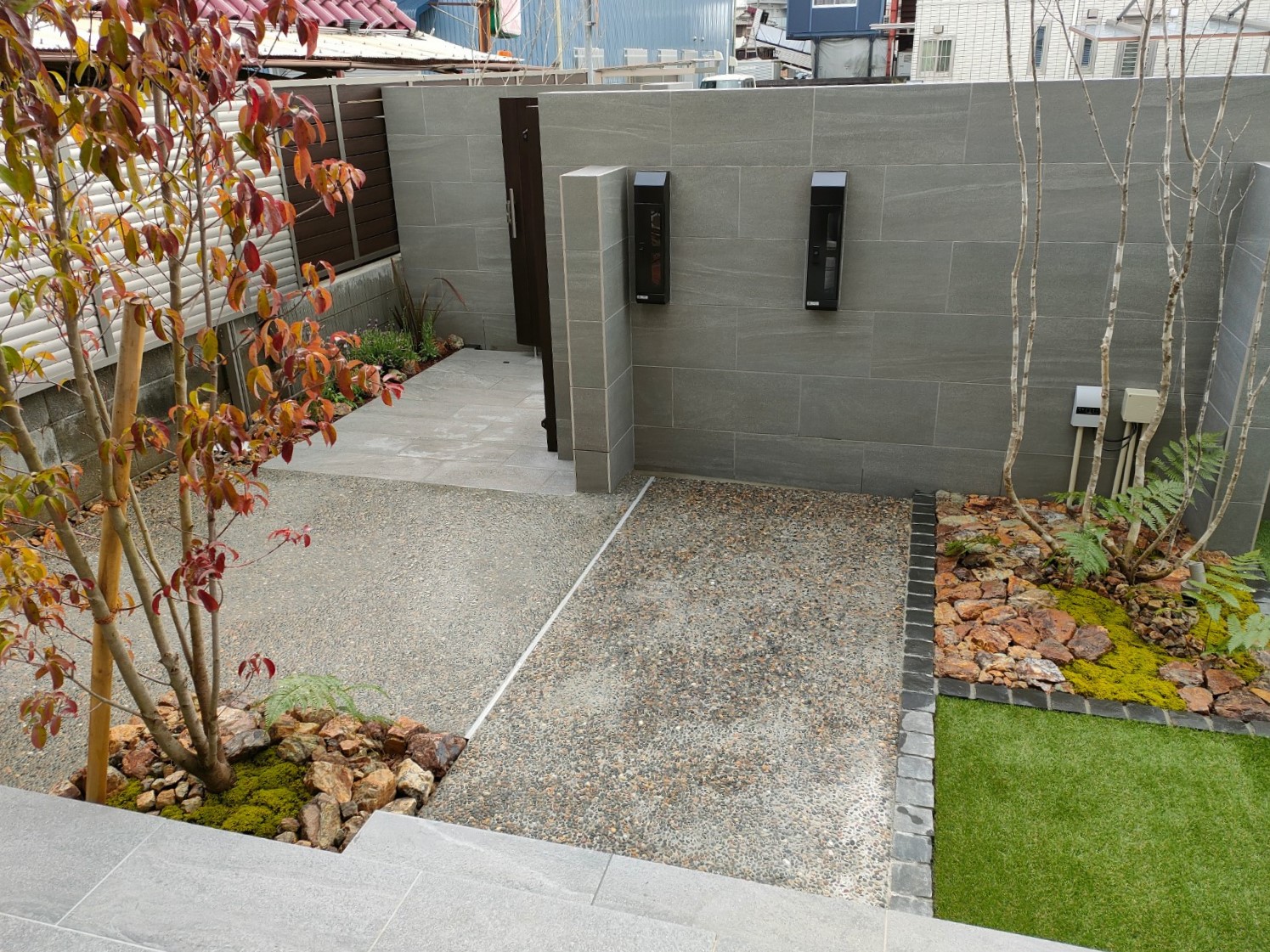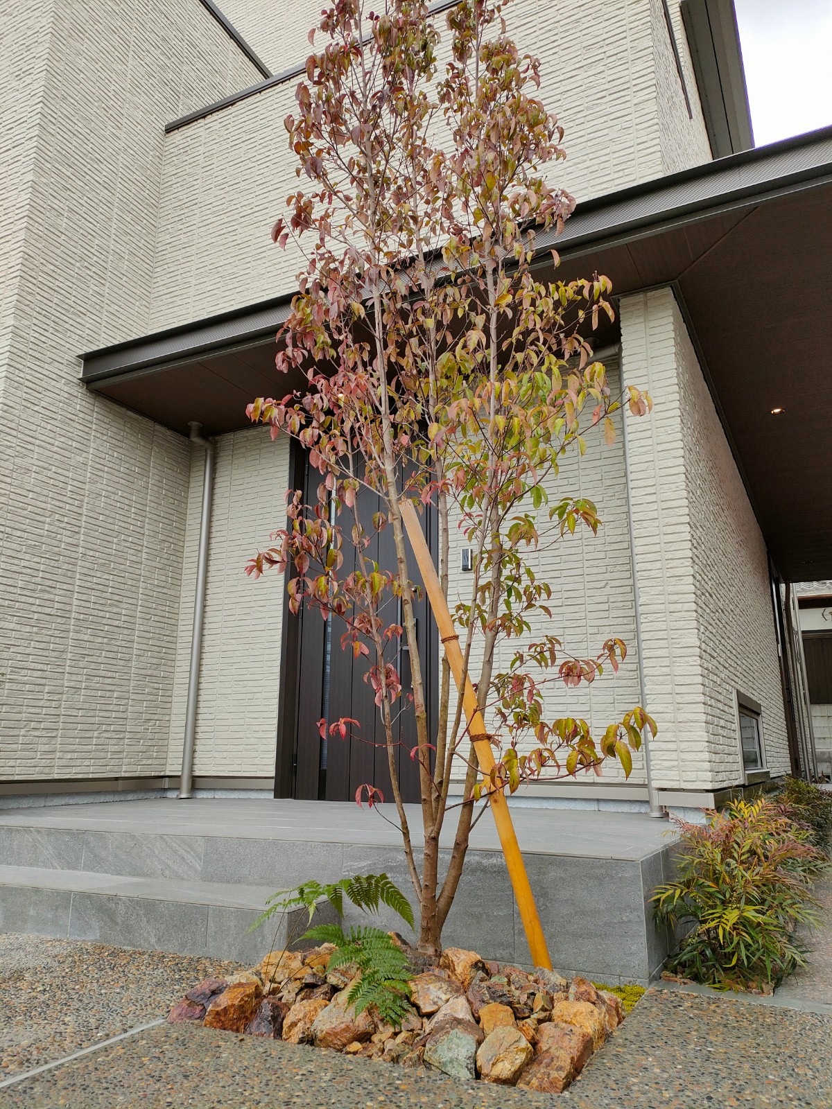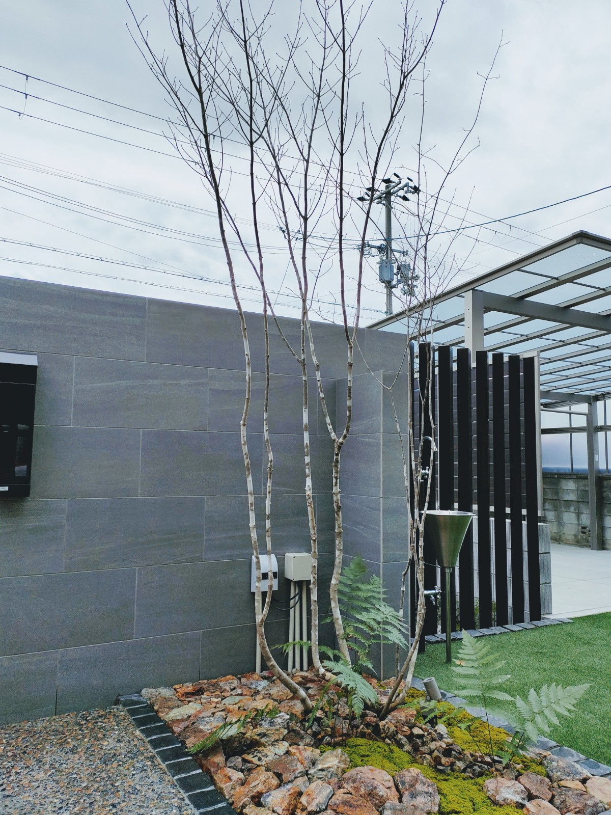 雨で濡れた自然石やスナゴケがきれいです 2022年3月21日(MON)玄関扉を開けると大きな雑木の足元におしゃれな坪庭があり毎日眺めるのが楽しくなります砂利を置くだけではなく組む感覚で敷く事で見え方も随分と変わります少しの植木でも雰囲気がありいい感じになりました門扉正面にはハーブを植えお客様を迎える度に ほのかにハーブの香りが漂います 常緑のヤマボウシ アオダモ 植樹風景 完成です