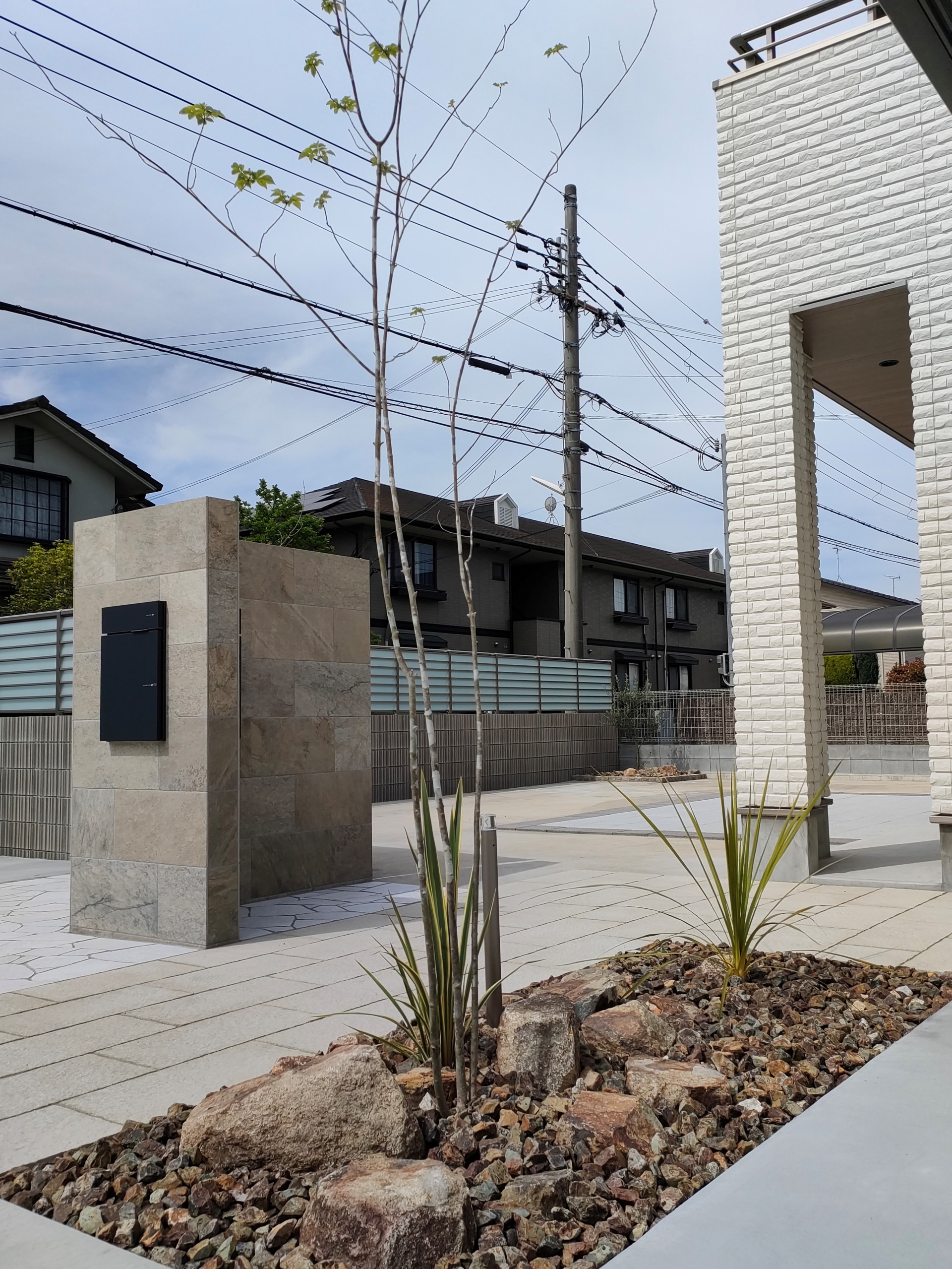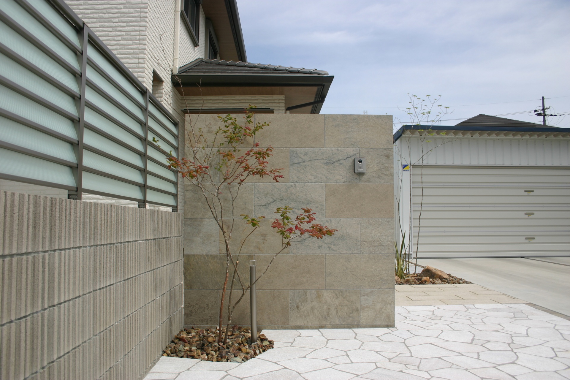 石目模様のタイルを背景にナツハゼを植樹 2022年5月10日(TUE)始めて使用する門柱のタイル(ユニソン:カタリナ グレーベージュ)CADとカタログの色目ではイメージが分かりにくかったので30cmサイズのサンプルを取り寄せ お客さんと何度も色決めをさせていただきましたもちろん化粧ブロックやアプローチや石張りの色も何パターンもの組合せ候補がありましたそして完成した門柱やアプローチに景石・植木の葉や枝ぶりで動きをつけることで全体に調和を図っています アオダモの足元に大きな景石を置きニューサイランと砂利でロックガーデンに オリーブ足元にも砂利を敷き詰めました