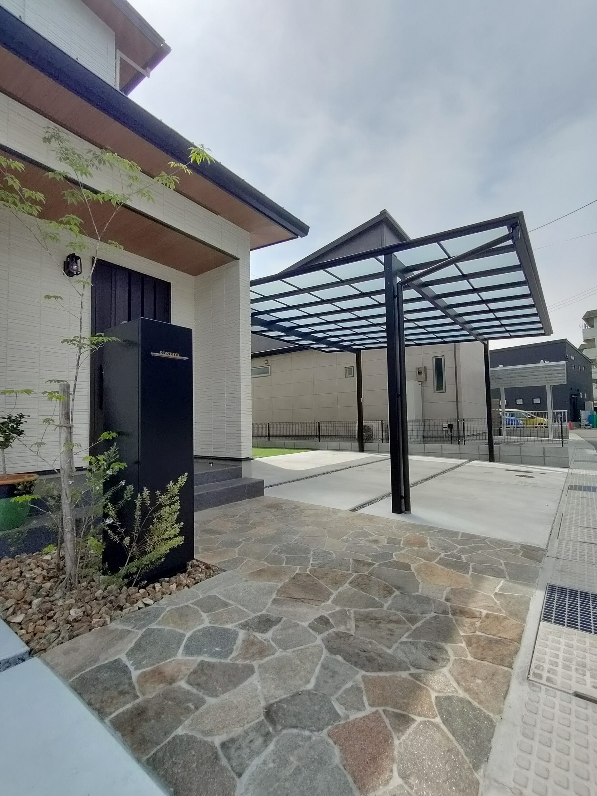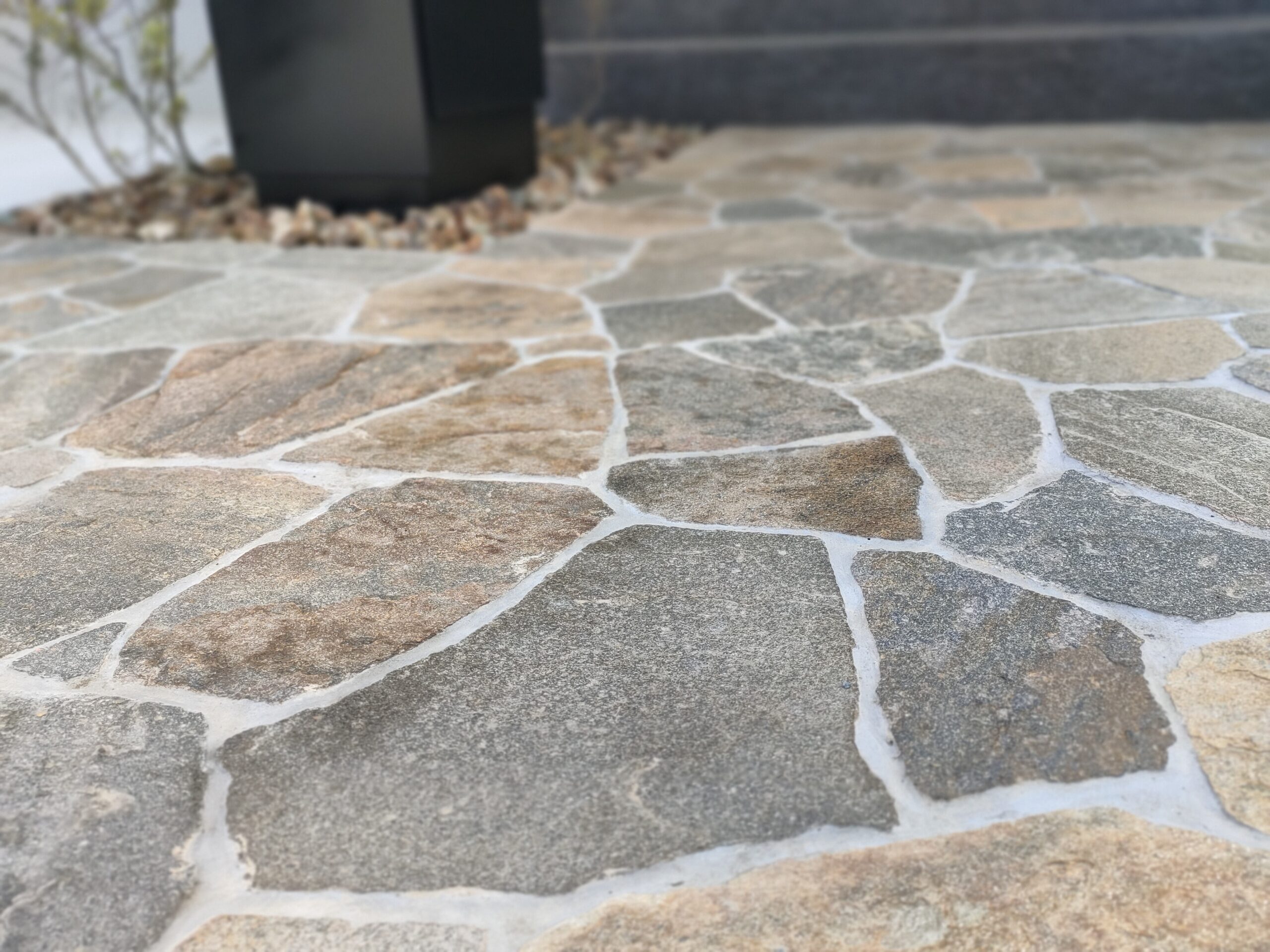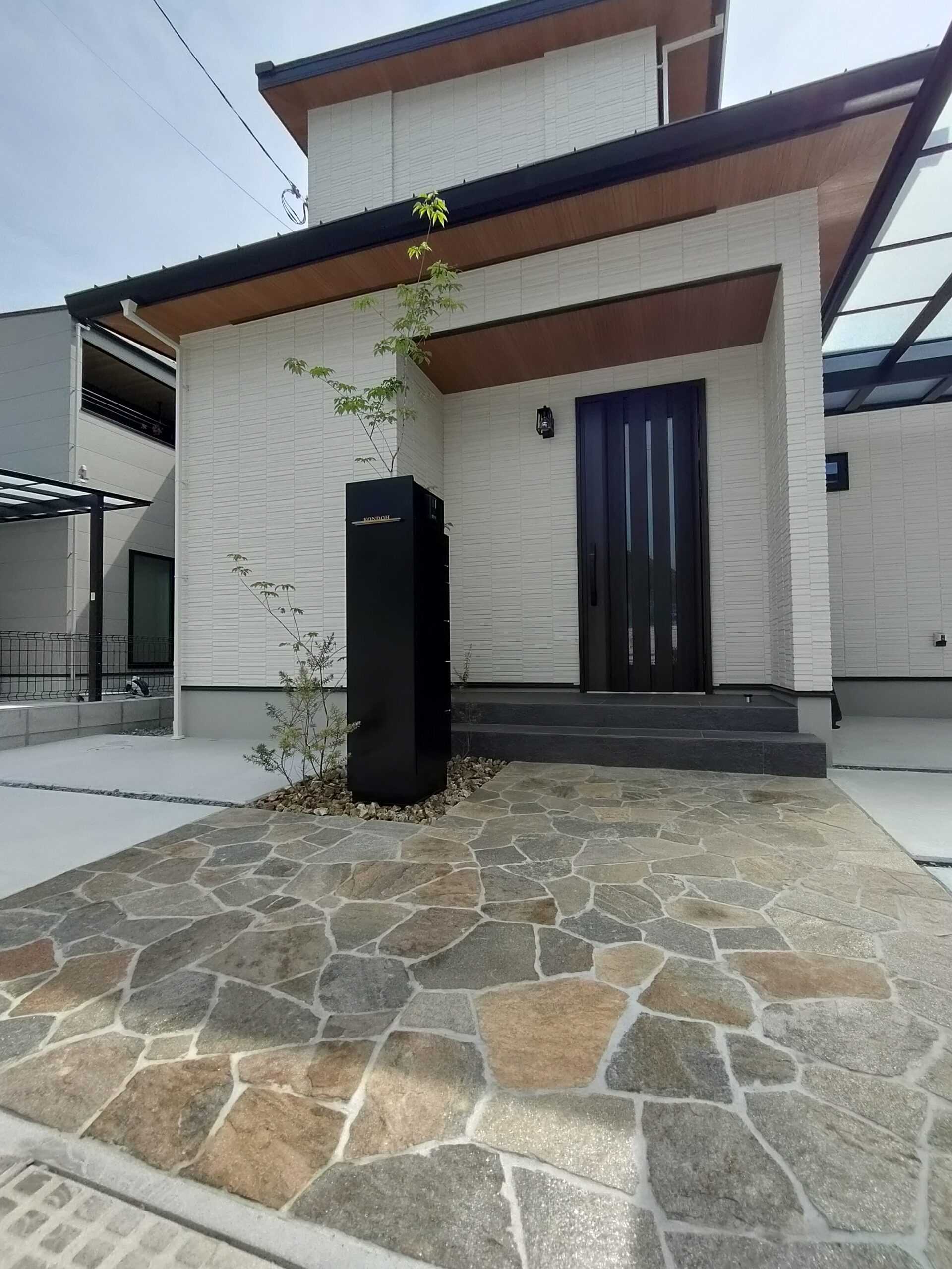 アプローチは門回りとのバランスが重要です 自然石乱張り エクステージ梶原です玄関前のアプローチに自然石乱張りを使用しています 一枚一枚に形や色ムラがありますが自然素材なのでお客様にはご説明し理解いただいておりますそして、当社職人さんの丁寧かつ優れた技術できれいに仕上がっております 「いつもありがとうございます(^^」アプローチのカタチや素材の色は門柱や玄関タイルとのバランスが大事となってきますプランを考えるうえでお家の顔となる部分ですから慎重にデザインします アプローチの一部分をくり貫き門柱や植栽スペースとして設けています 玄関ポーチから道路までの間を自然石で敷き詰めています建物軒天に使用されていますライトな木目色にも自然とマッチします