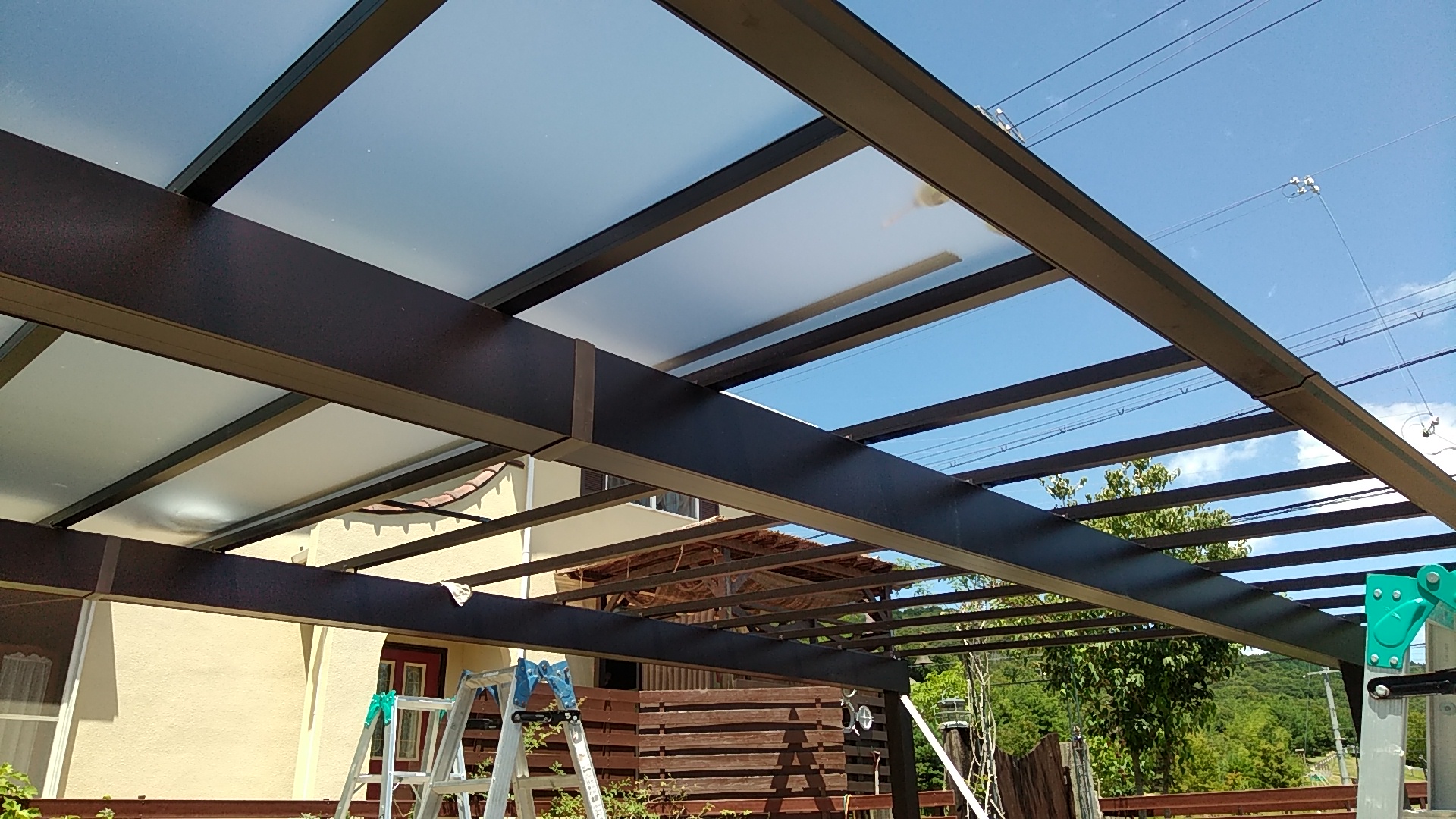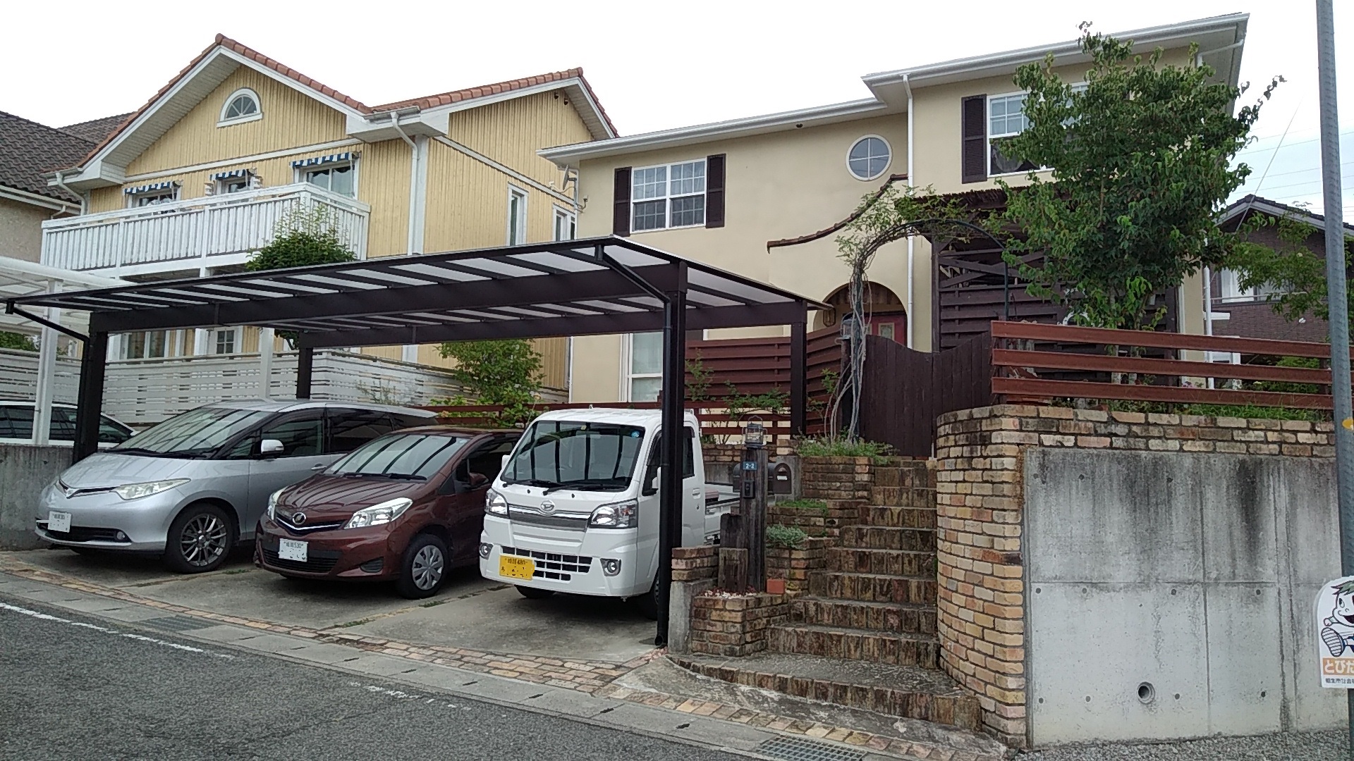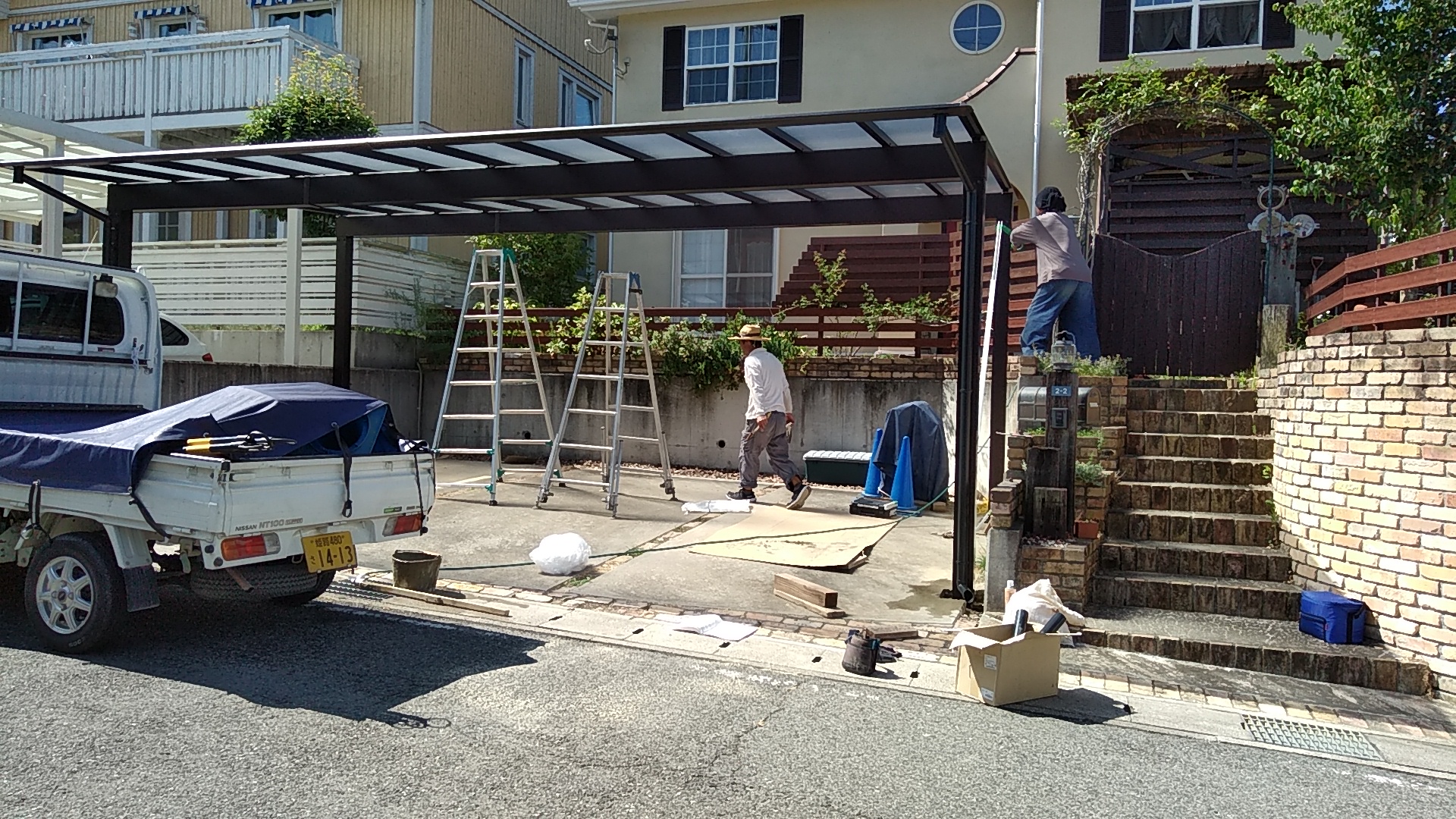 相生カーポート 施工3台分屋根 クレーンで梁上げ 車庫リフォームのカーポート工事