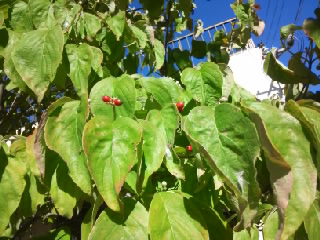 こちらは、ハナミズキです。沢山、赤い実が付いています。よく見ると、蕾が・・・