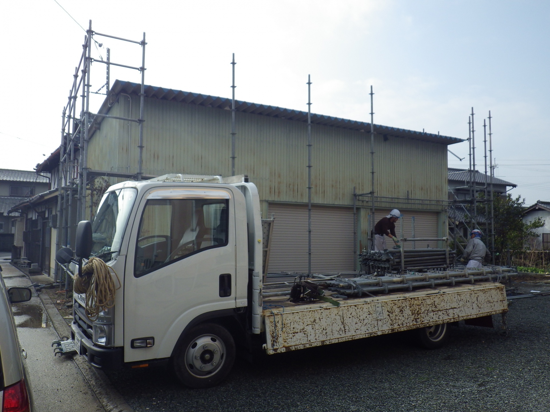 足場を組立て倉庫のリフォーム工事にうつります。まずは屋根の改修工事から