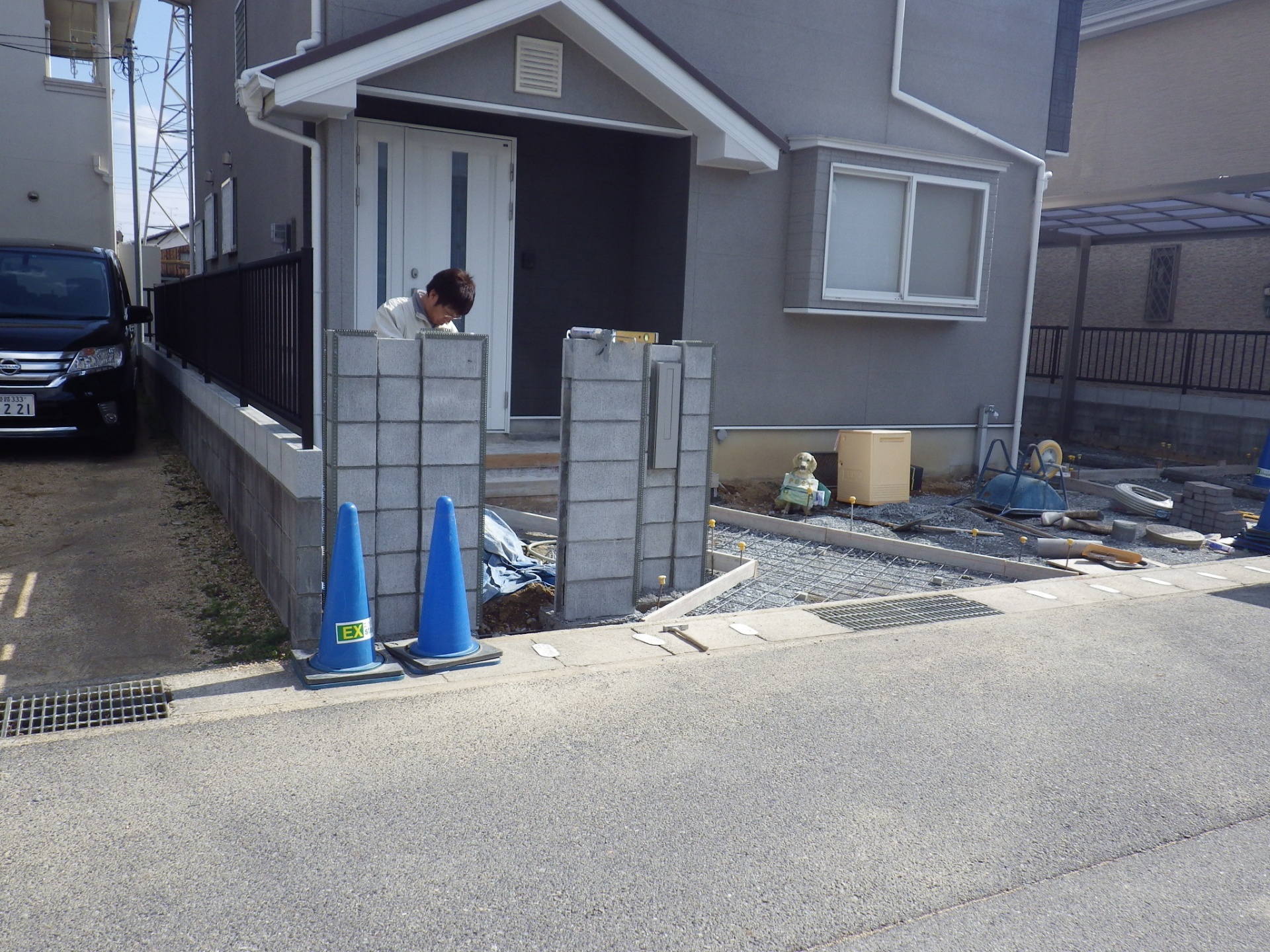 ブロック下地積み工事も完了で、吹付け下地工事 アプローチタイル工事に移っていきます。