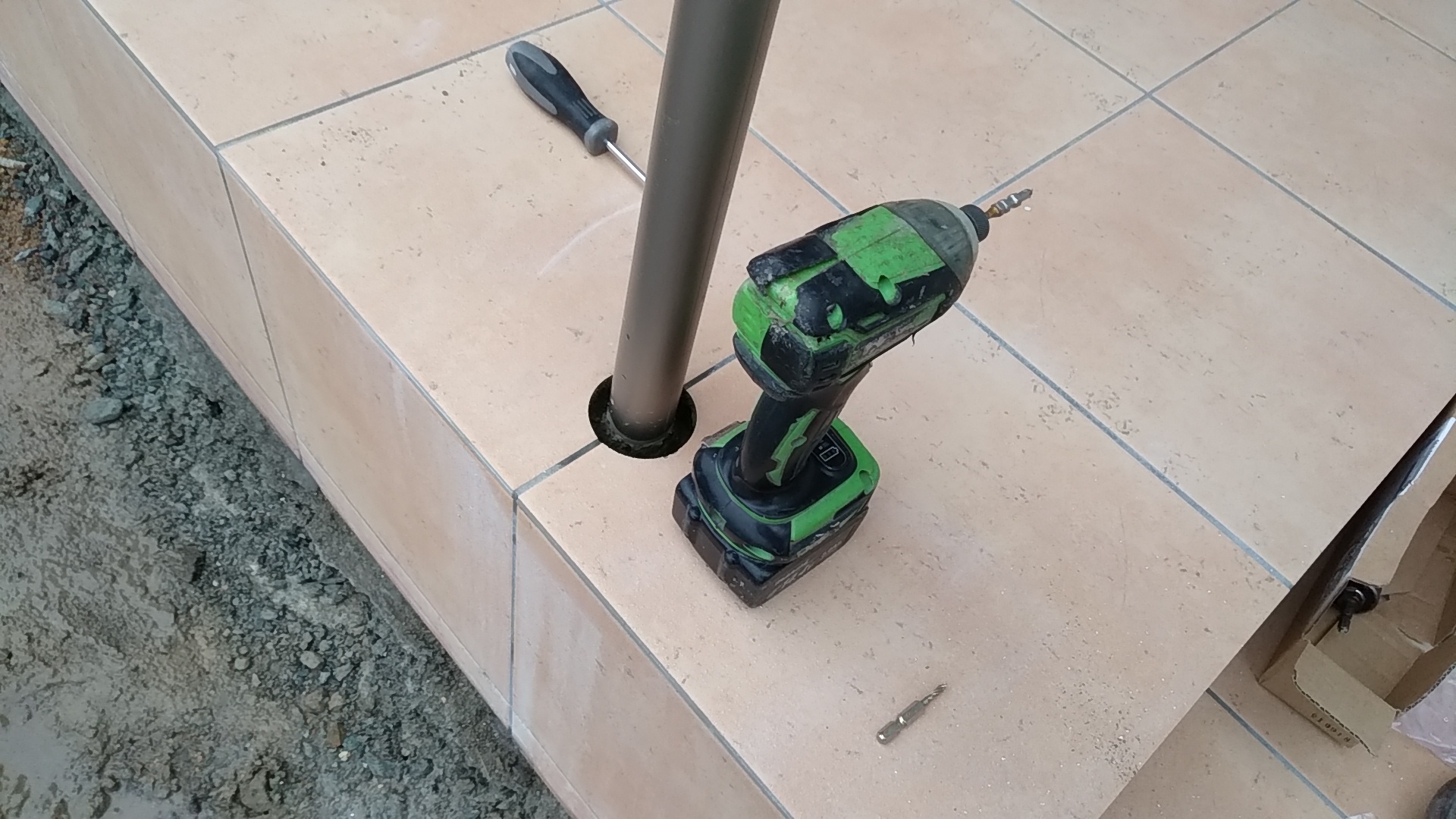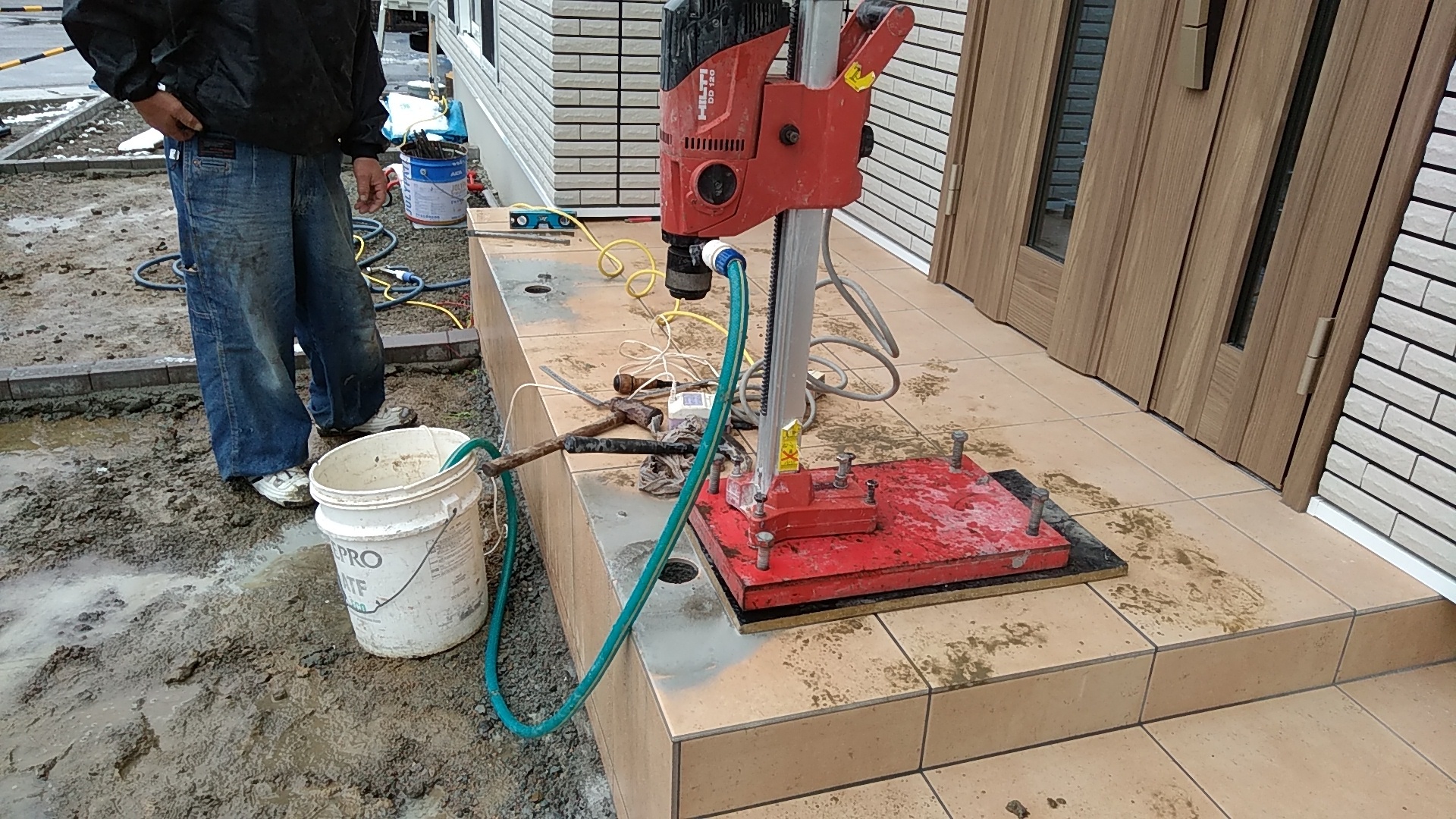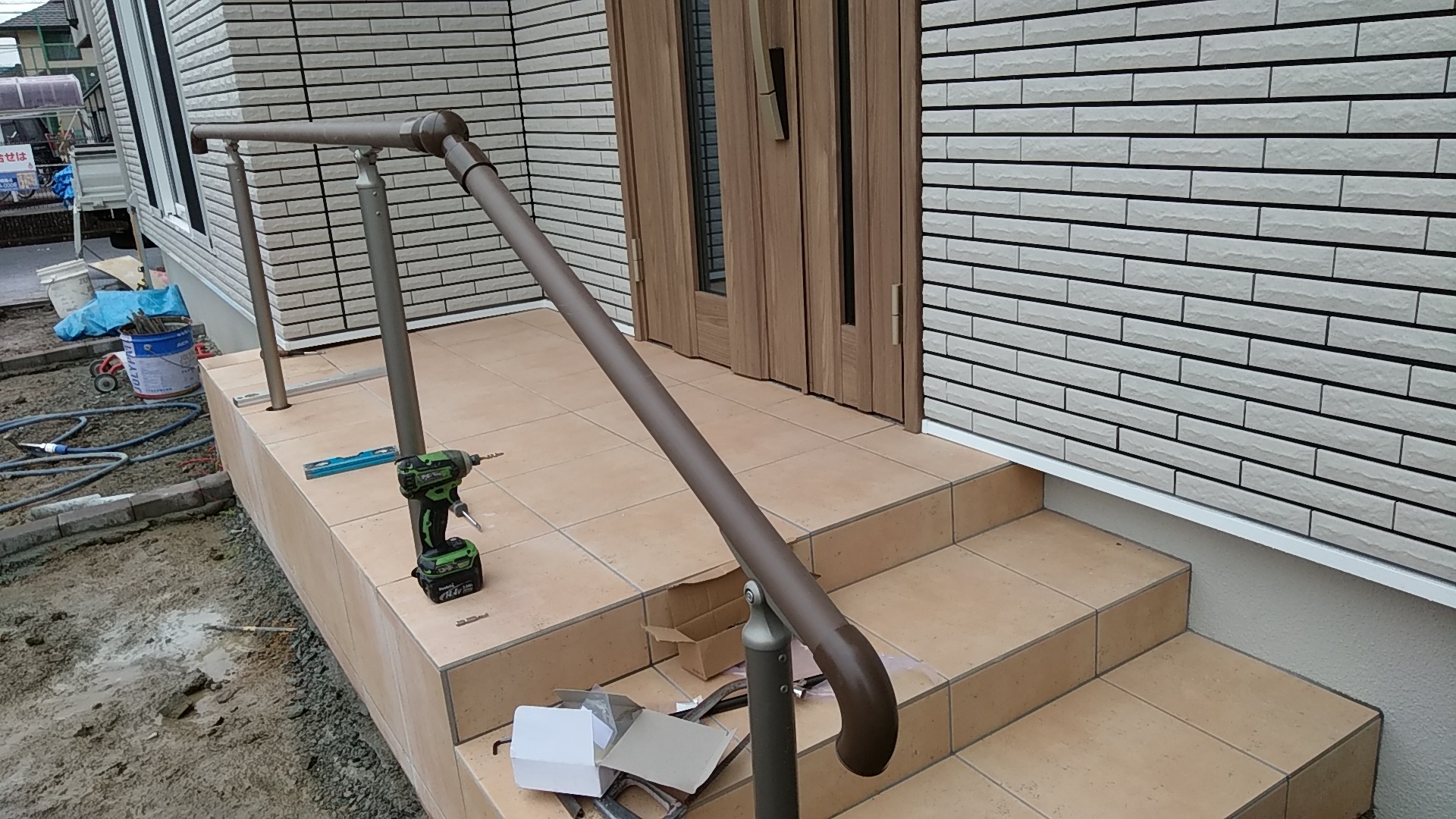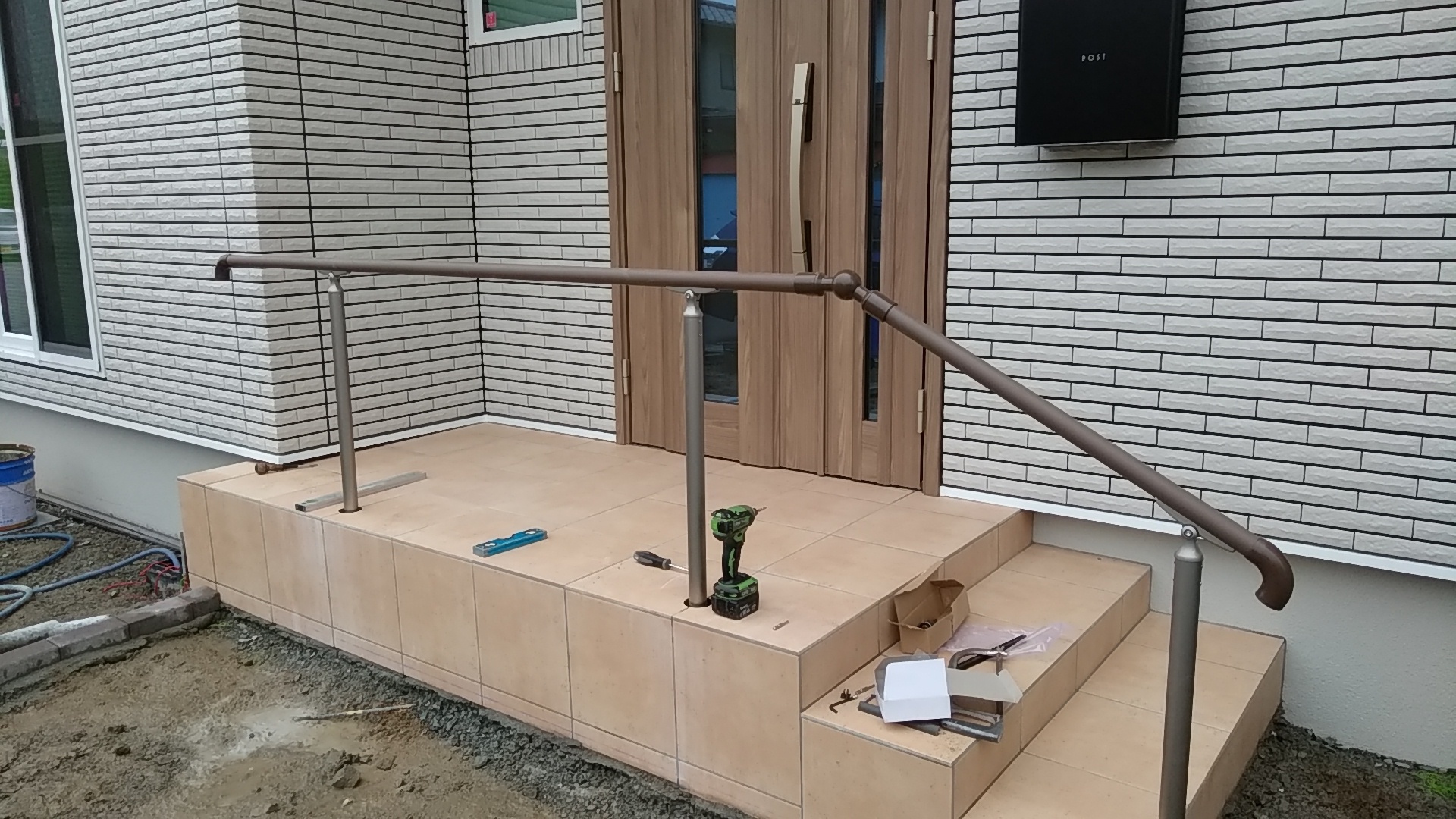玄関ポーチに手摺の施工 姫路のエクステリアショップ 玄関ポーチに補助用の手すりを施工しますダイアモンドコアという特殊な機械を使って筒状に穴を開けます なかなか価値のある機械です今回は38ミリ 樹脂の手すりビームの施工です 38ミリはつかみやすい一般的な 手摺径ですアルミですと夏場熱くて持てないので樹脂製をご提案しました手摺工事エクステージにお任せくださいもうすぐ 誕生日先日からこの新しい名刺を新規のお客様にお渡ししています ほぼ自分の中では完成形ですが今年受ける最後の住宅関係の資格取得で完結予定です色々 住宅関係・建設業界のもろもろ・いろいろありますが自分自身国家資格しか頭にありません来年の今頃よいお知らせができればいいのですが頑張ります(^^♪ひがしぐち たかし