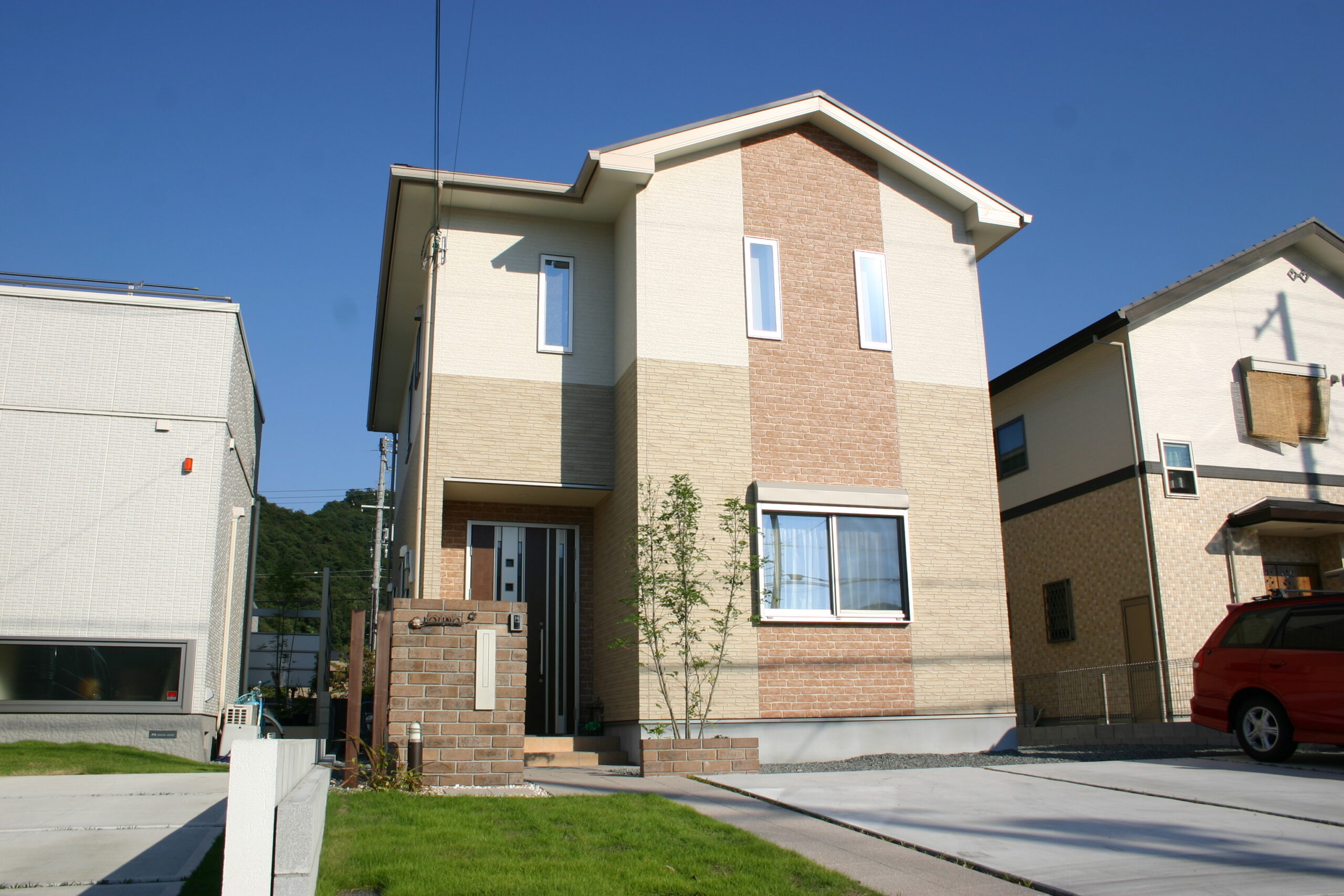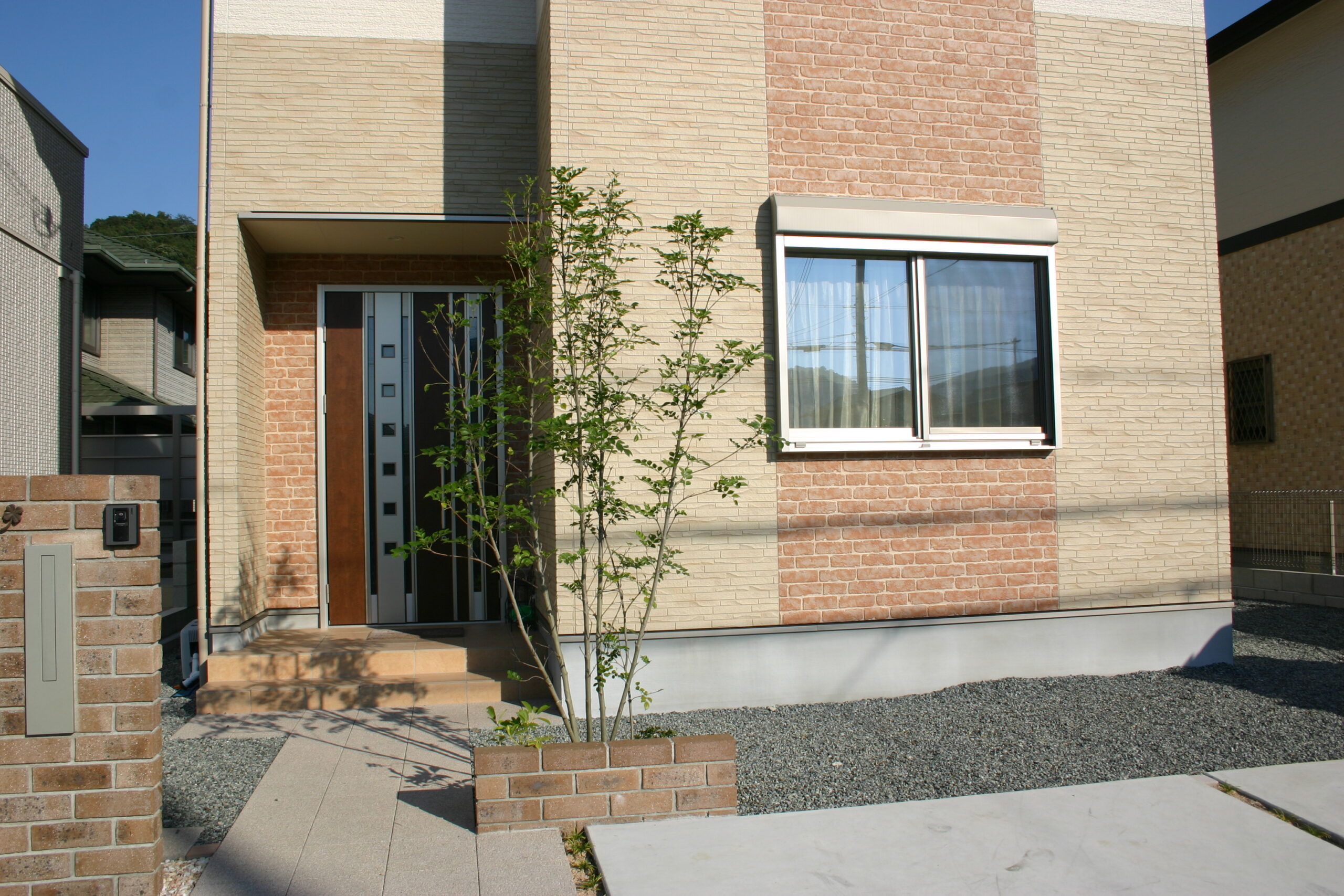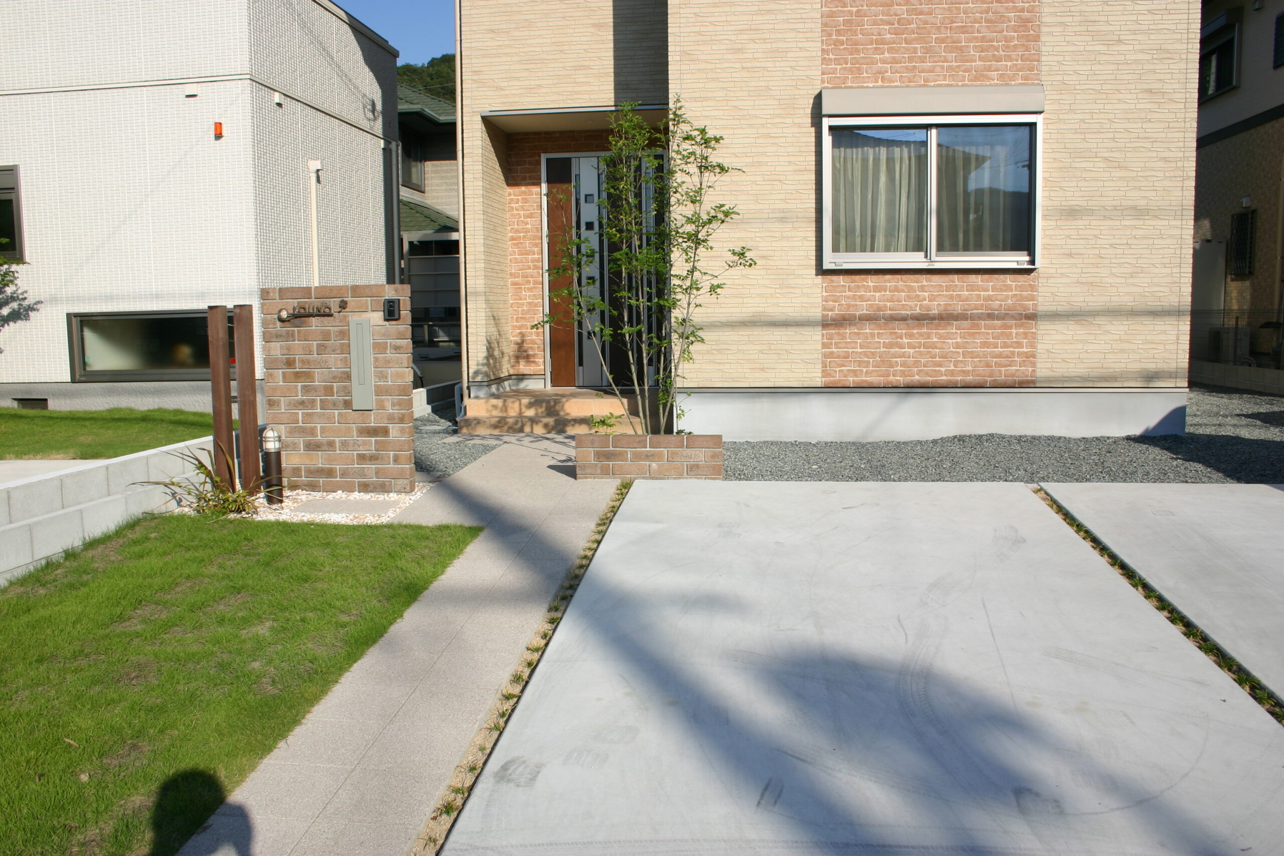 レンガ門柱 姫路 エクステリア デザイン施工例 レンガの門柱デザイン 姫路のエクステリア屋さんブログ ブラウンのレンガで門柱をデザインしました レンガはやっぱり 一生物ですね芝生のグリーンとの相性がいいです姫路でのエクステリア工事はエクステージにお任せくださいひがしぐち