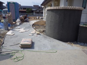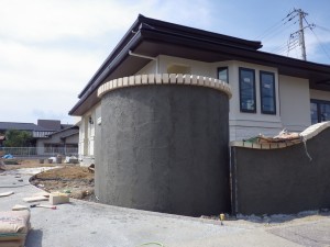お城をイメージした曲線門柱。吹付け下地の塗り付け中です。
