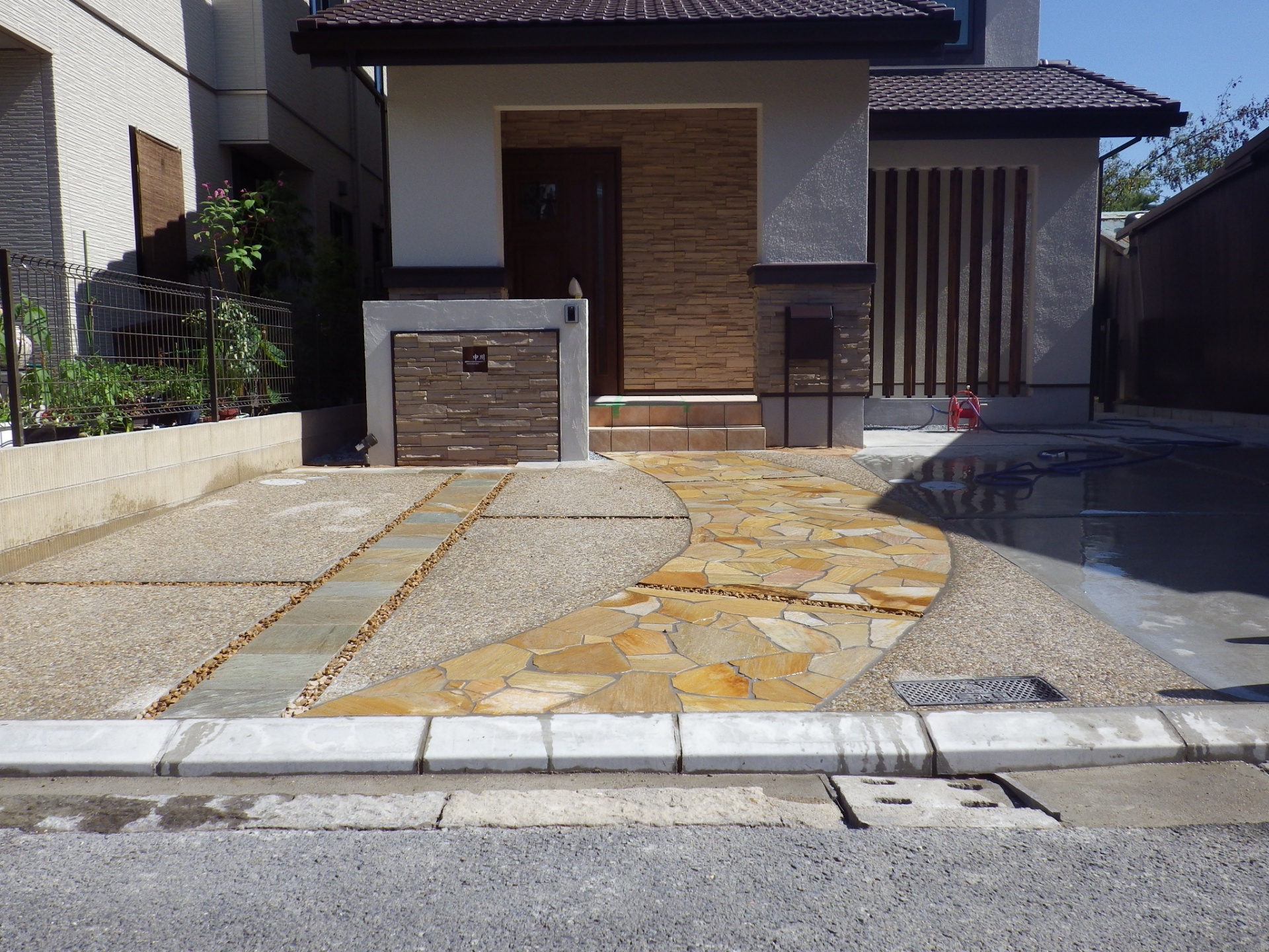 シェルゴールドの自然石と淡路砂利の本洗出し仕上げの本物志向のエクステリアデザインです。