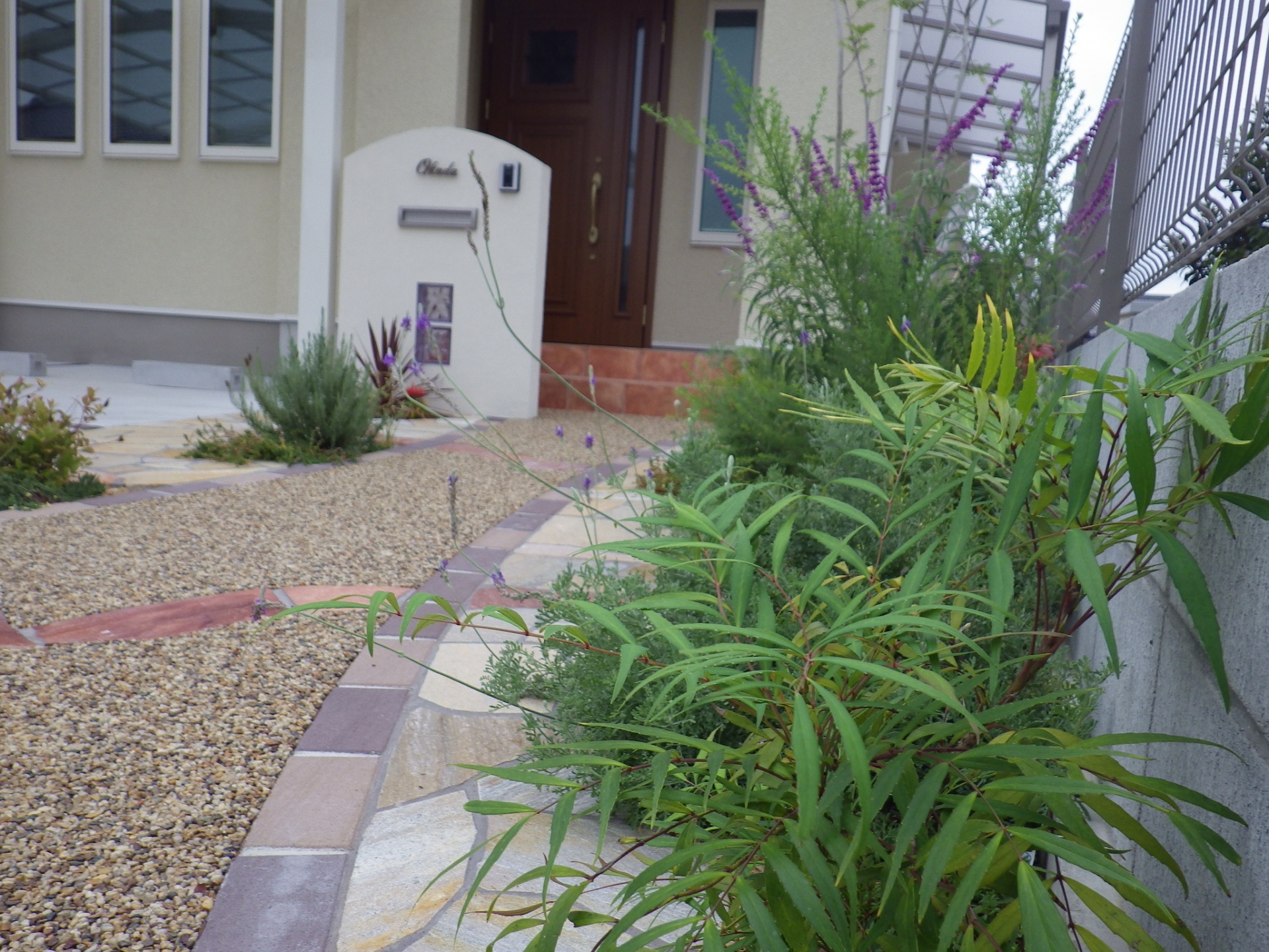 マホニアのグリーンが生き生きしてアプローチを演出してくれます。