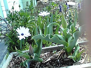 新入りのチューリップ、まだ咲きませんね! ディモルフォセカも沢山咲いています。
