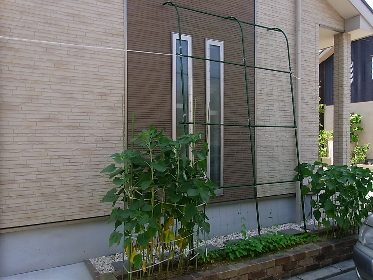 夏の西日対策に、緑のカーテンの骨組みも準備万端です