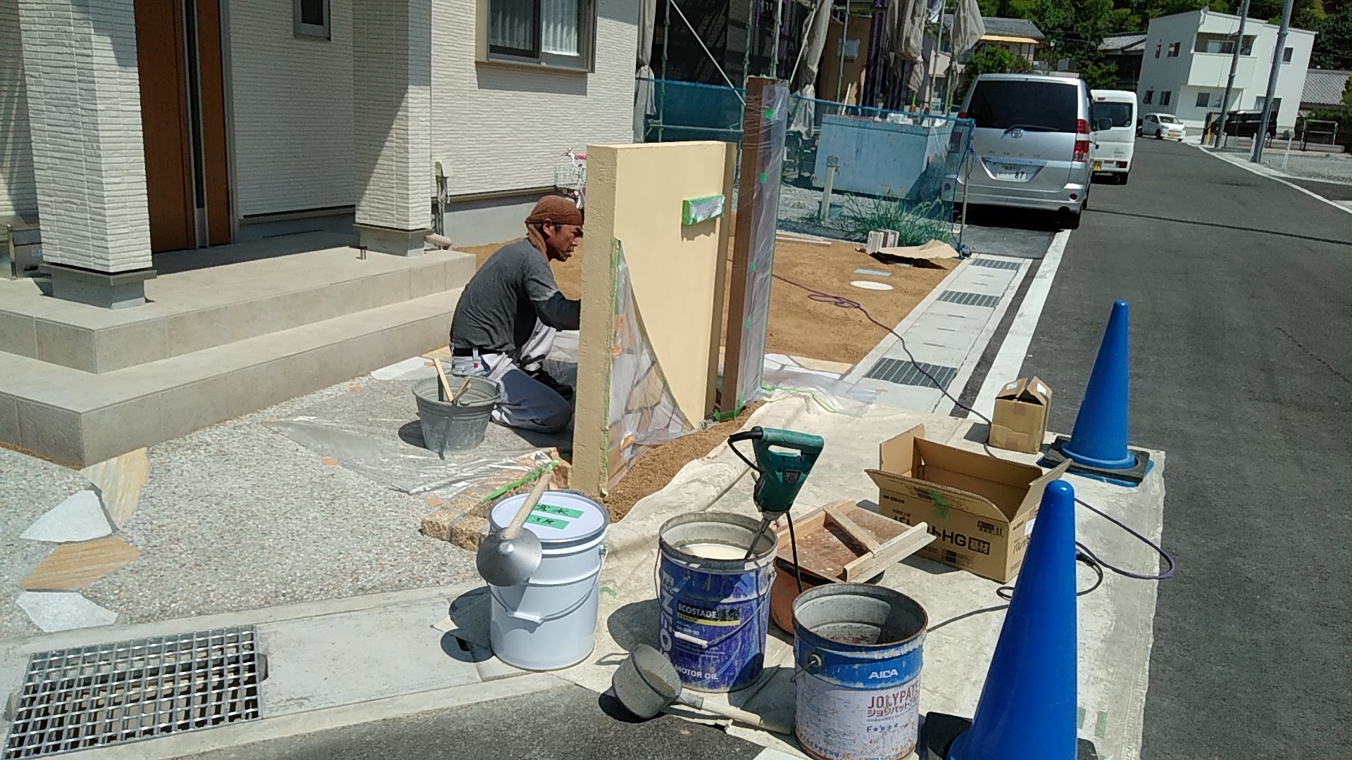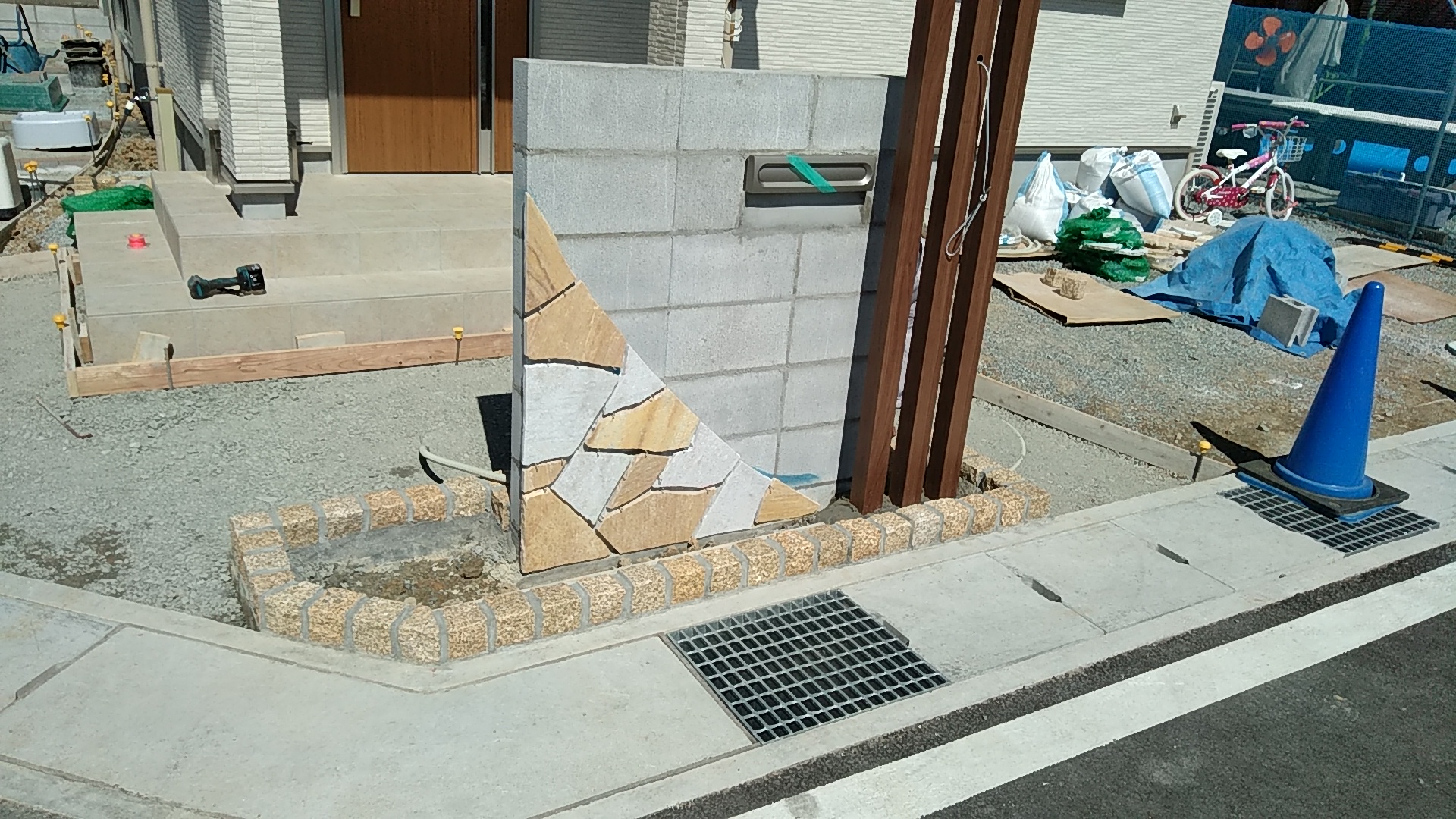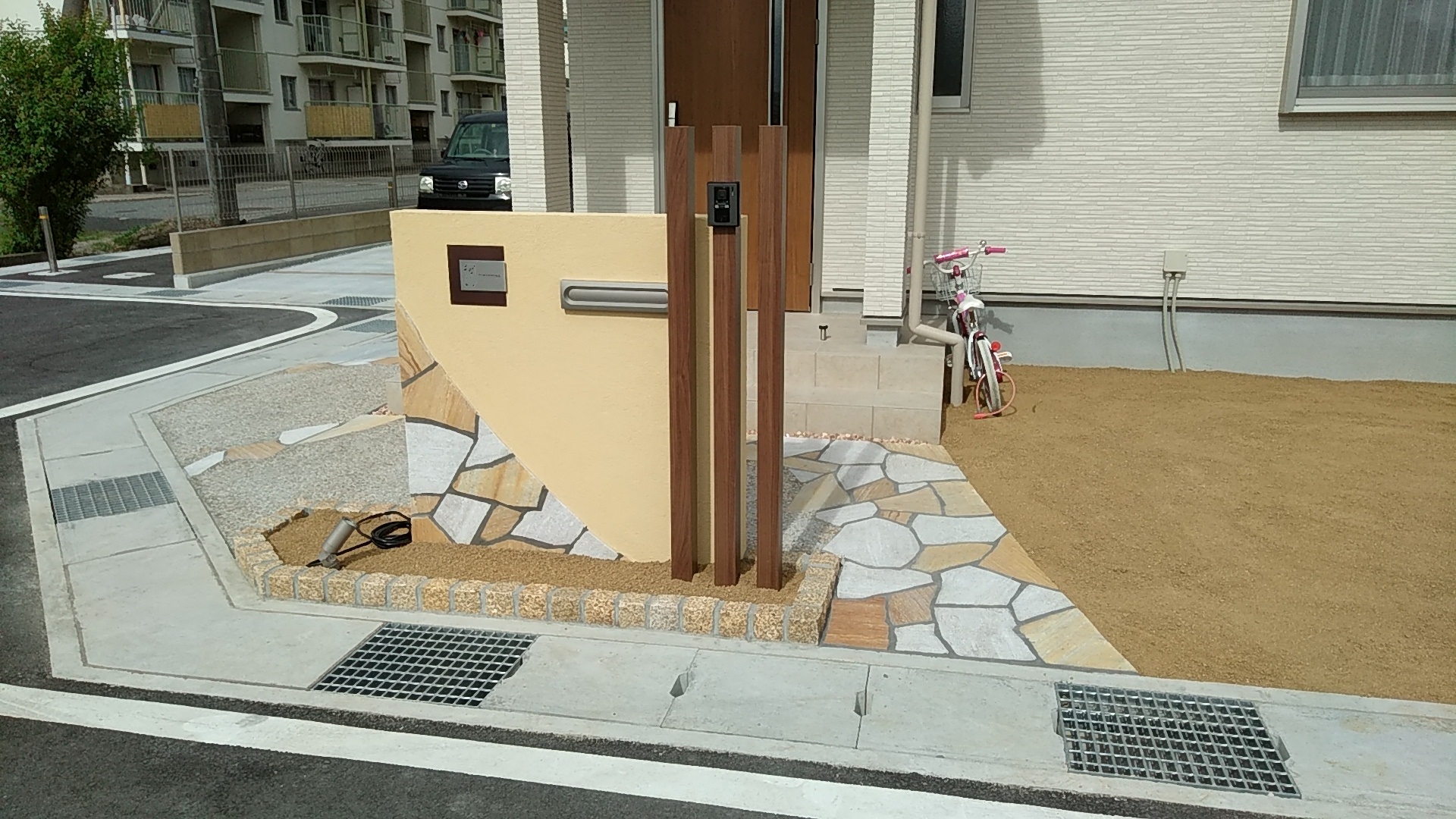 姫路市 新築 エクステリア 自然石のポイント門柱 姫路エクステリアデザイン 門柱に自然石をポイントにしたデザイン門柱 控え壁なし仕様の為 インターホンは角柱でカバーエクステージ デザイン門柱です アプローチは洗い出しで仕上げましたエクステージのセメント本洗い出し お客様に好評です 今回は淡路砂利 3分を使用しました 姫路市 たつの市 太子町でのエクステリア工事は 各種1級施工管理技士の現場監理する 太子のエクステージにお任せください 安心をお届けします エクステージ ひがしぐち