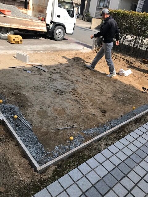 車庫拡張工事 パーキング増設 駐車場拡張 駐車場拡張工事 現駐車場のサイドにもう一台駐車スペースの拡張です 土留めブロックを解体して 土間不要残土の鋤取りです レンガラインで装飾して土間コンクリート打設 築25年以上前ののお宅がデータ的に拡張リフォーム工事が多いです車庫拡張工事は建設業法上の各種1級施工管理技士の現場監理する太子のエクステージにお任せくださいひがしぐち