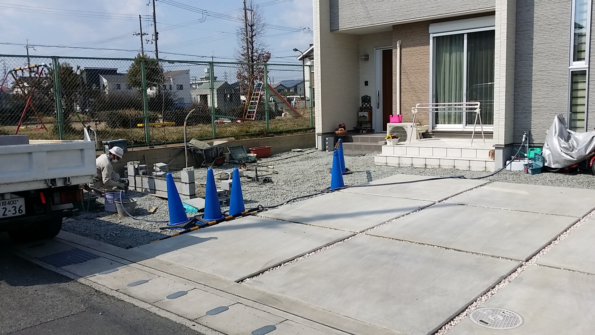 門柱前はちょっと帯状に洗い出しでデザインします