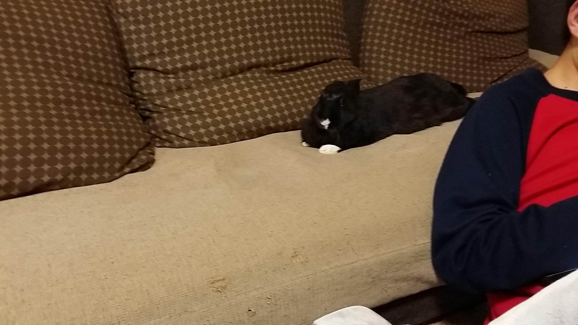 ゲームしている息子の後ろでジッとするRabiちゃん