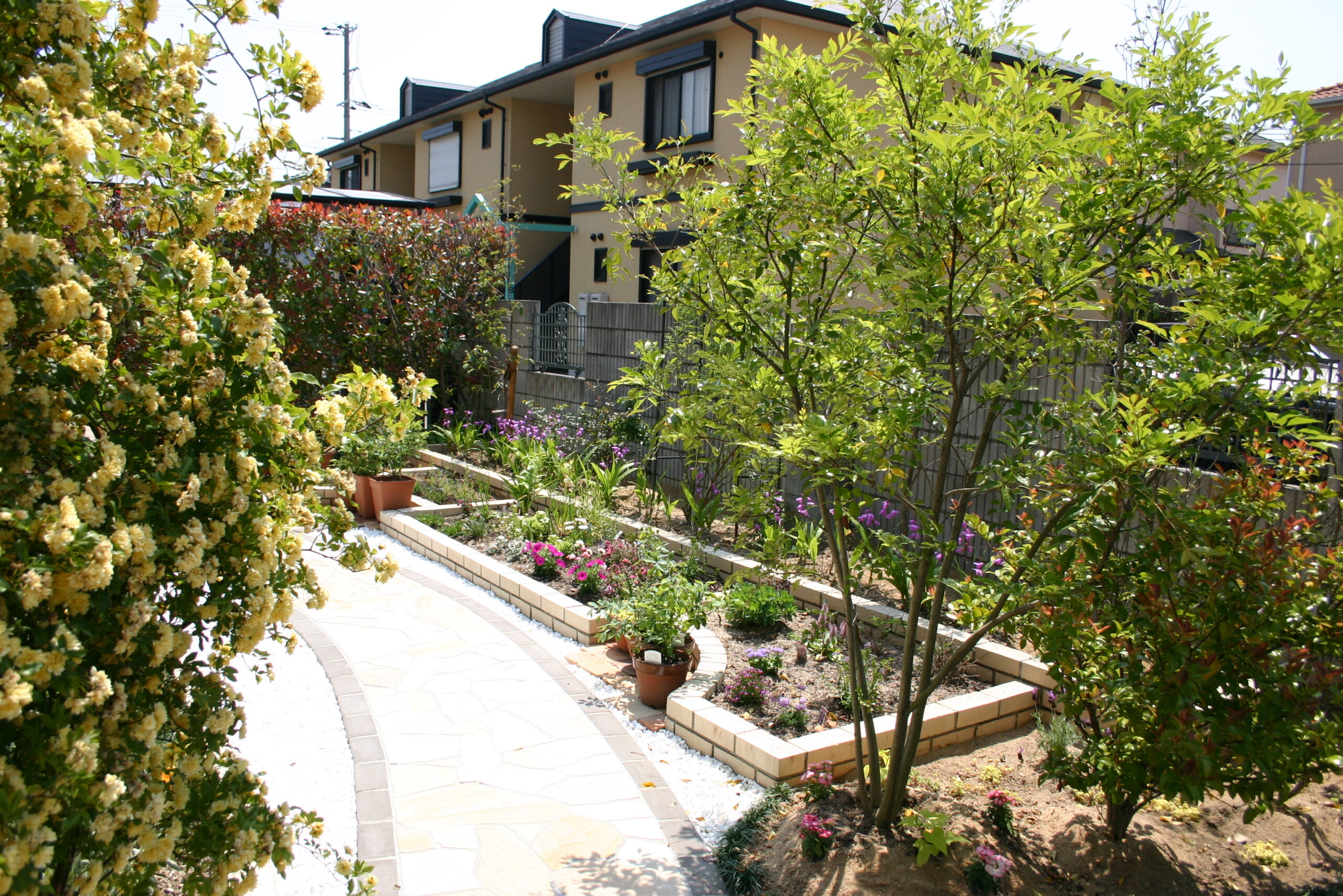 花壇リフォーム工事 ガーデンリノベーション 姫路市のガーデンリフォーム工事 ホワイトレンガのローボックススタイル花壇 私らしいデザインです 球根関係を一時避難しての施工となりますきれいな 紫蘭ですエクステリア ガーデンリフォームは各種1級の施工管理技士の現場監理する太子のエクステージにお任せくださいひがしぐち