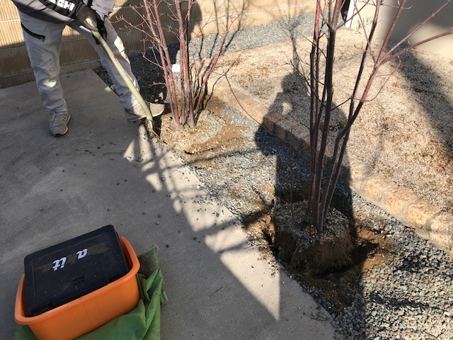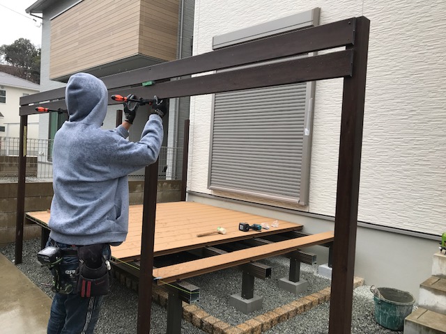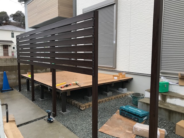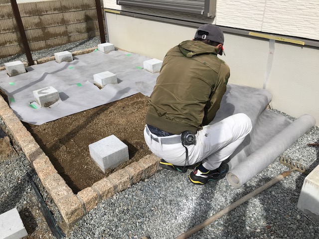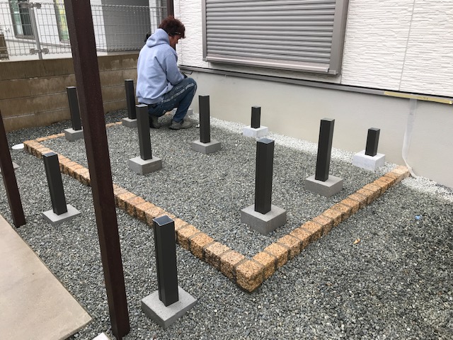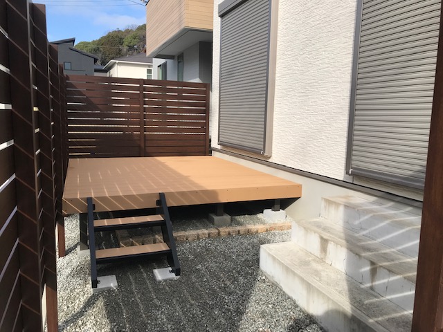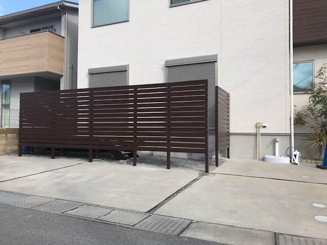 目隠しリフォーム 太子町エクステリアリフォーム 目隠しフェンスリフォーム とりあえず植木を植えていたお庭 本格的な目隠しにリフォームします デッキ下防草シート処理束石施工 アルミウッド調フェンスタカショーeアートウッドすき間15ミリ 目隠しフェンス工事は太子のエクステージにお任せくださいひがしぐち