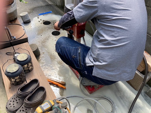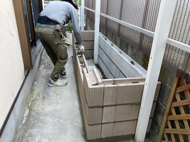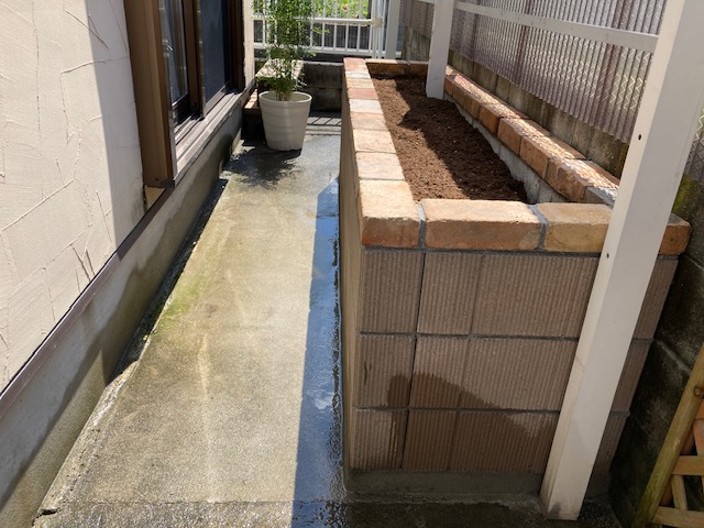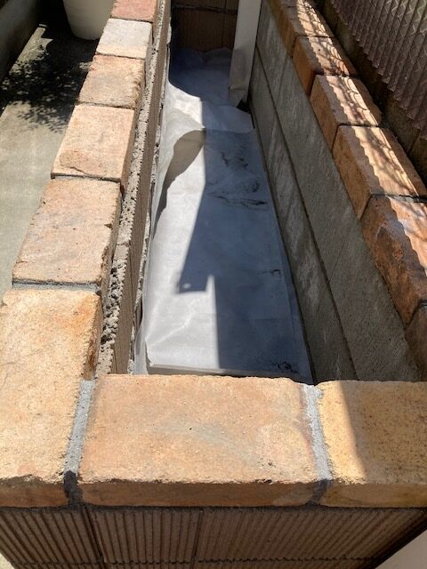 目線の高さまで花壇リフォーム エクステリアリフォーム 花壇をリビングから見える高さにとご希望 コンクリートをコア貫で排水確保 化粧ブロックを積んで天端をレンガで化粧 腰をかがめなくてもガーデニングができます エクステリアガーデンリフォーム お任せ ひがしぐち
