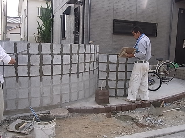 曲線のデザインなので、1個1個ブロックを半分にカットしてうまくアールに積んでいきます。