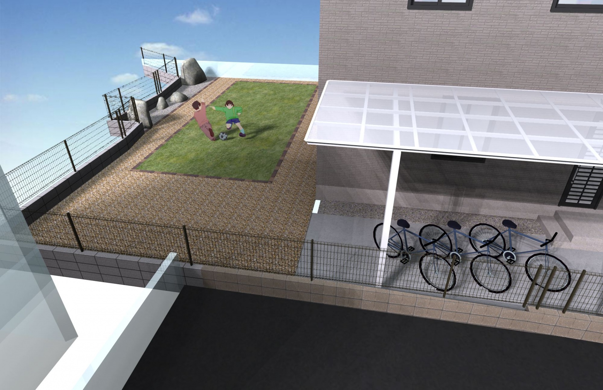 南面のお庭は、サッカーの練習が出来る芝生スペースになります。