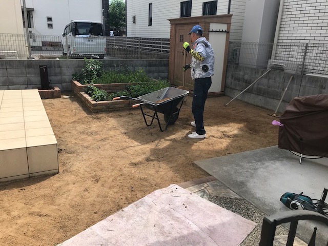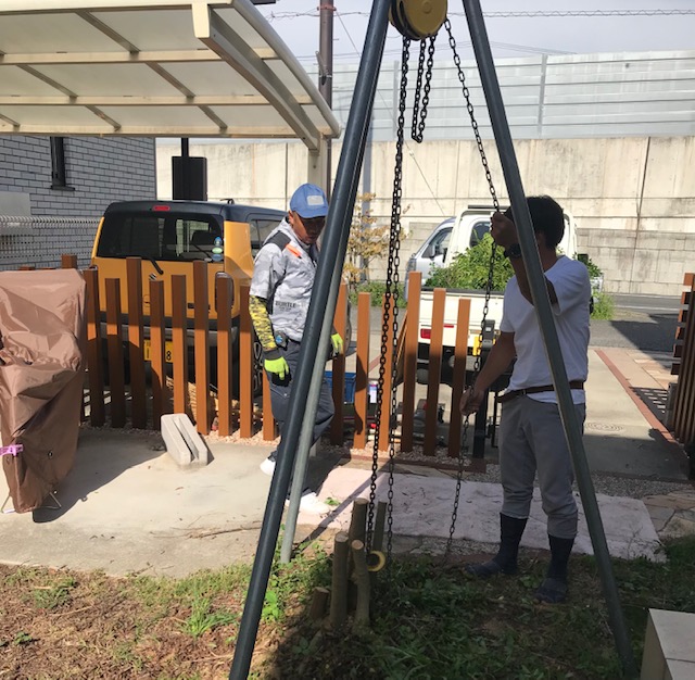 お庭のリフォーム工事 姫路 エクステリアリフォーム日記 お庭のリフォーム工事です まずは植木の伐根 チェンブロックでバッキバキと引き抜きますエクステリアリフォーム工事は 1級の施工管理技士の在籍する 太子のエクステージにお任せください まずは水道移設と鋤取り整地より始まりますエクステリアガーデンリフォームエクステージひがしぐち