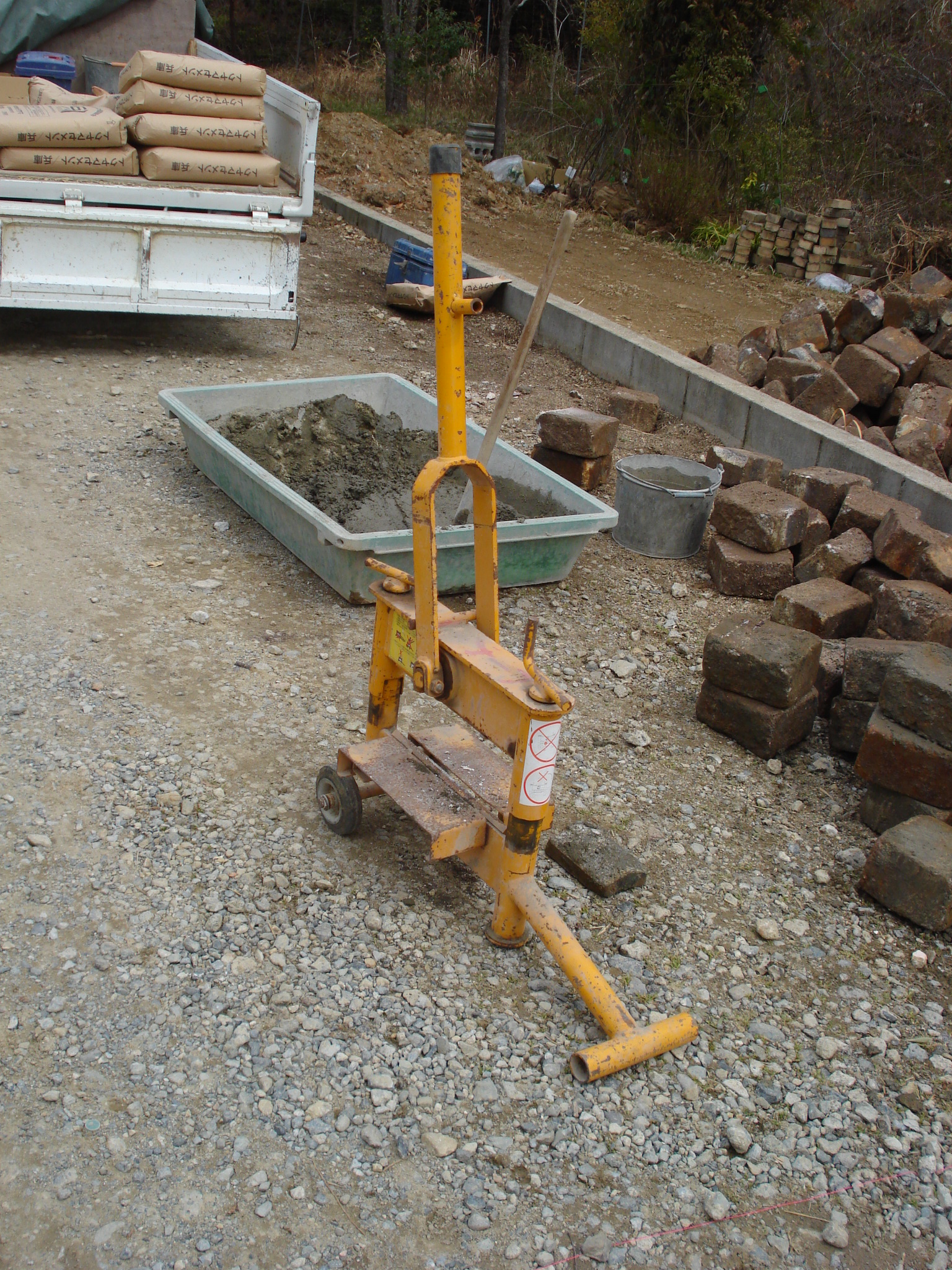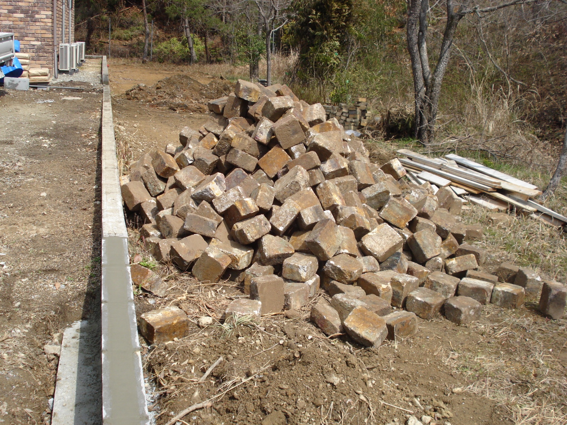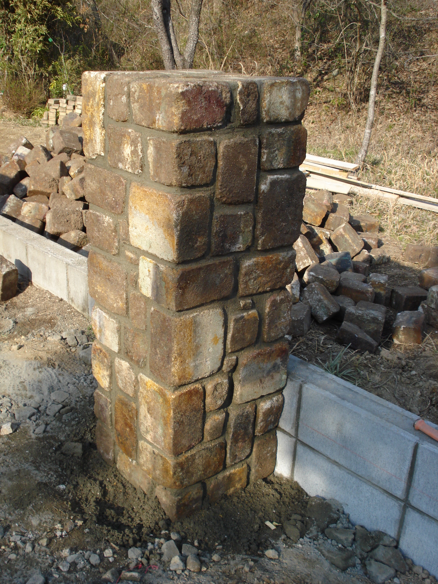 境界のブロック積みから始まって、今日やっとレンガ角柱が2個積み上がりました。