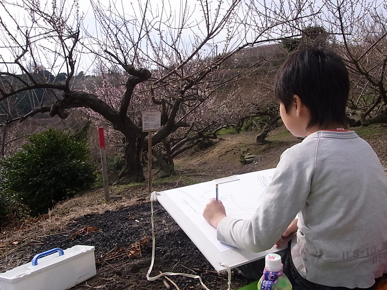 梅林園写生大会に参加 先日、息子と御津町の梅林園へ写生大会に行ってきました。 まずは、場所取りから モデル?は、この梅に決定! まずは、スケッチから 場所が通路のすぐそばのせいか、通りかかりの人に 「ま~上手ね~」などの声をかけられながら、一生縣命描く息子。 花が七分咲き位でしたが、絶景地からの眺めは、実に綺麗でした。 色づけの状態です、なぜか写真はここまでしか撮っておらず、完成した絵をお見せ出来ないのが残念です。 結果は、三月末楽しみです。