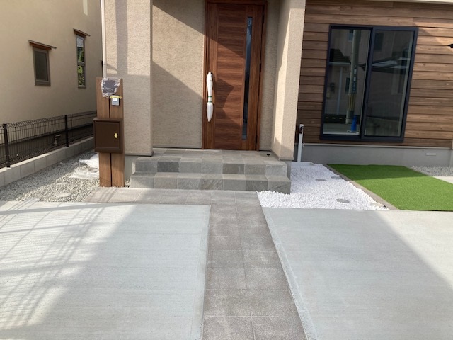新築外構 人工芝と白玉ジャリ 新築外構 店長の助っ人で新築一時担当しています 人工芝のスペースに白玉ジャリのリビング前空間 お車3台余裕で駐車できる広々カースペースです 新築外構は1級の各種施工管理技士の在籍する 太子のエクステージにお任せください ひがしぐち