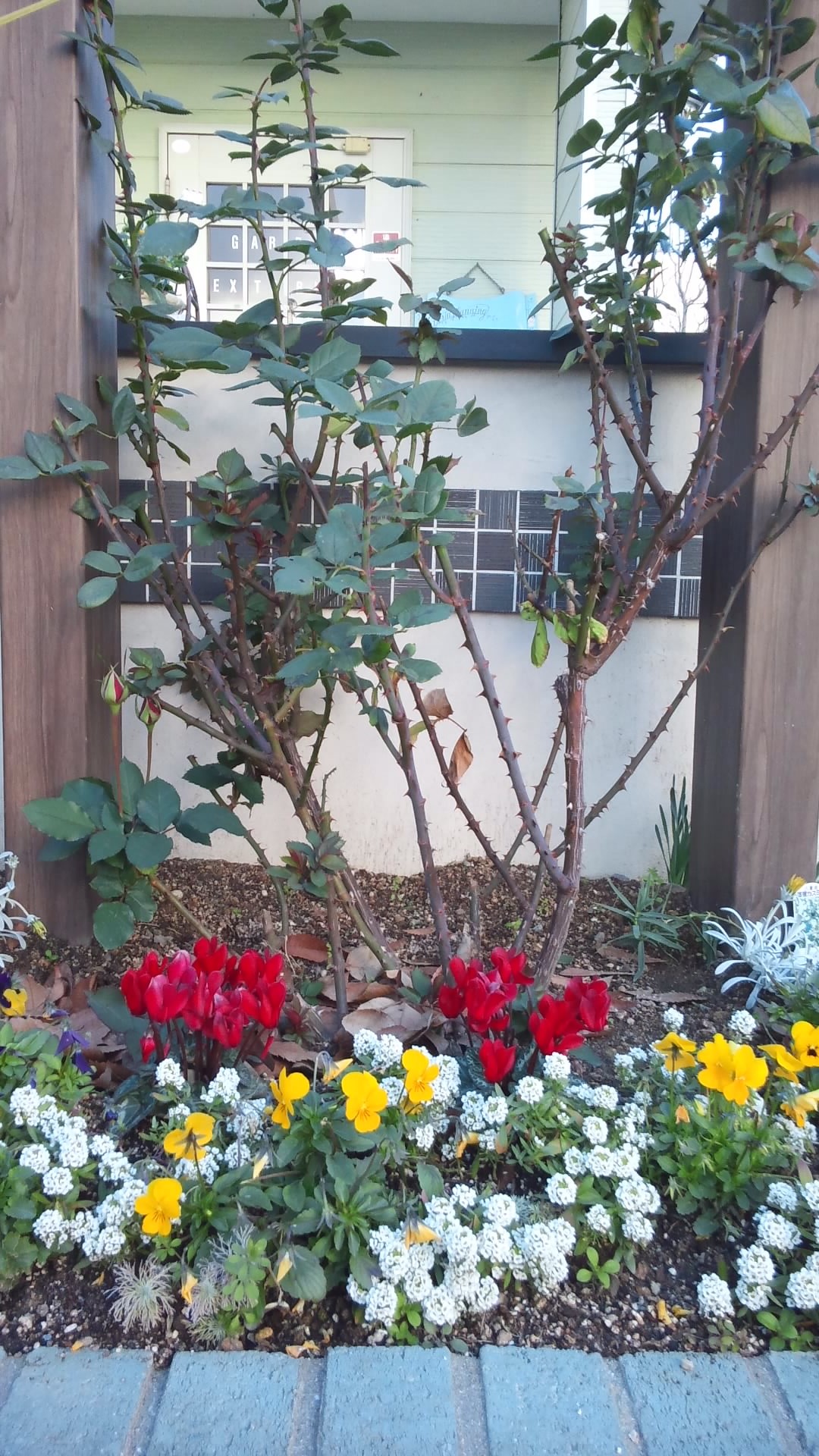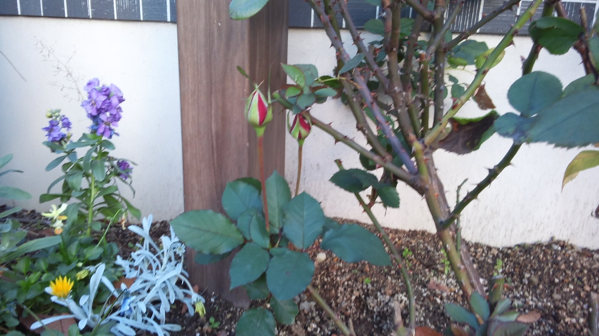 先月ブログで花壇の薔薇(いただいた薔薇)の蕾が、やっと赤い色の蕾が見えてきましたよ!