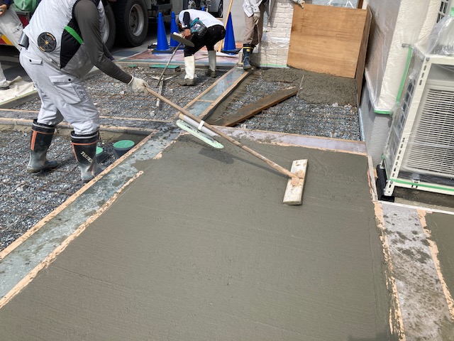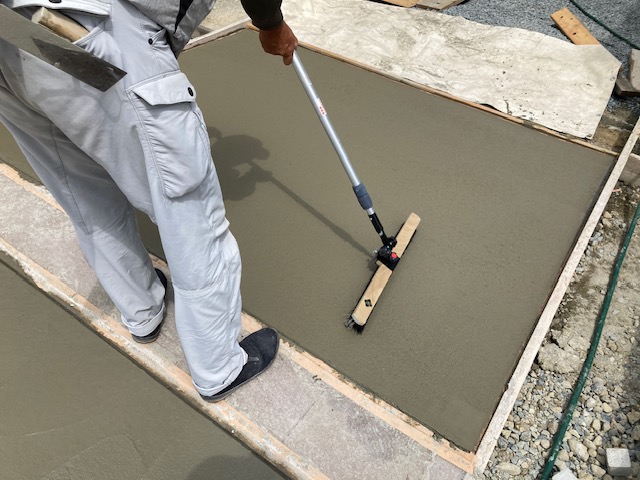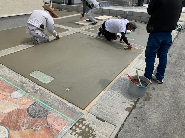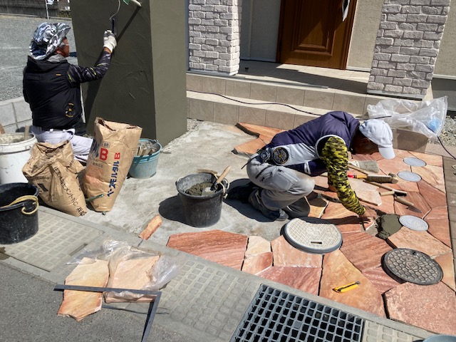 自然石乱形アプローチ 姫路新築外構 自然石乱形のアプローチ 今回はピンクをセレクト マンホール回りも切り込んで 丁寧に仕上げていきます コンクリート打設 養生を丁寧にして 5名で一気に打設 真夏は冬部の倍 人手がいります 今回は刷毛引き仕上げ 滑り止めと タイヤ痕の目立たないことが利点です新築外構は他店さんとは違う1級5業種施工管理技士の在籍する太子のエクステージにお任せください安心をどうぞひがしぐち